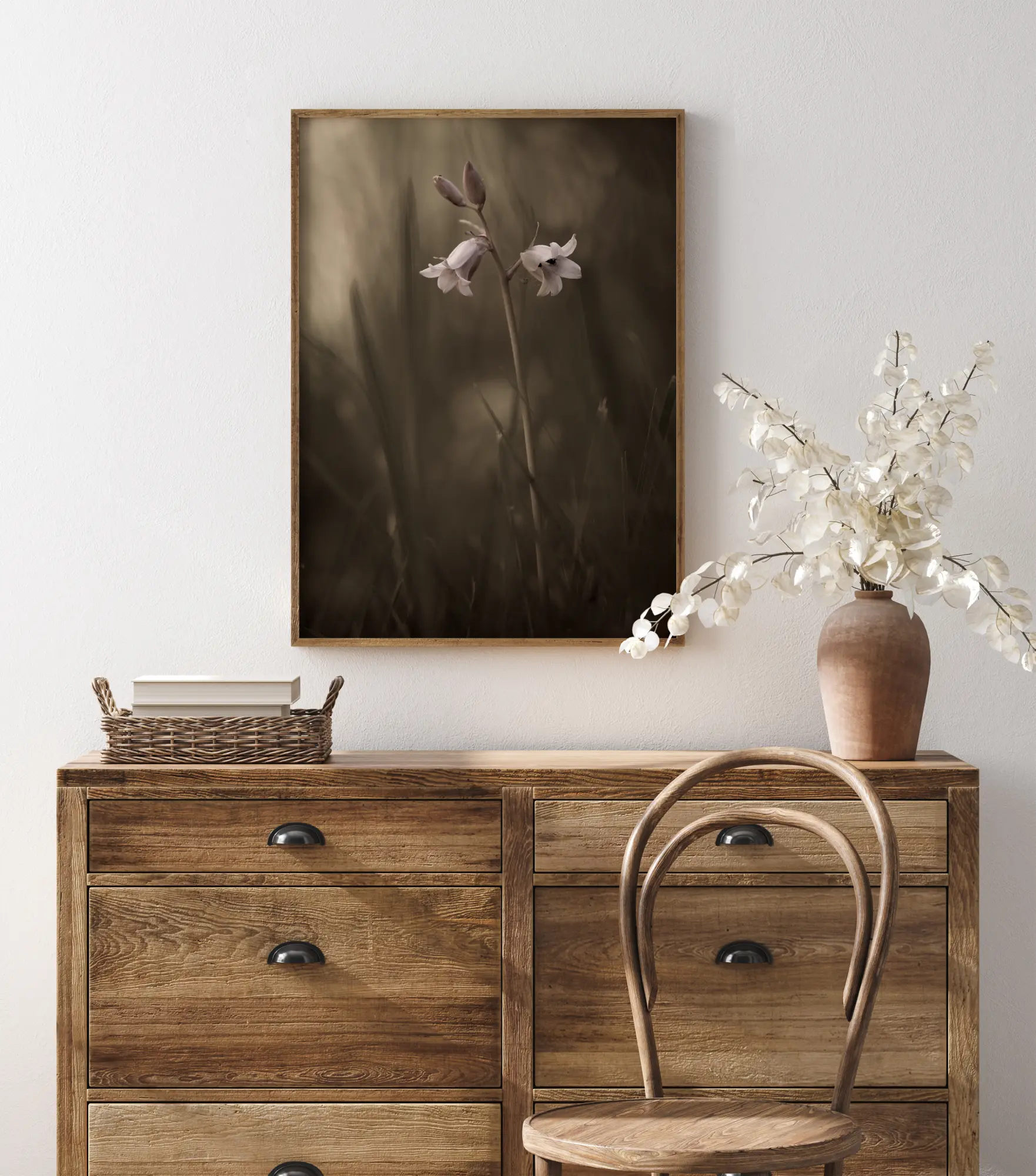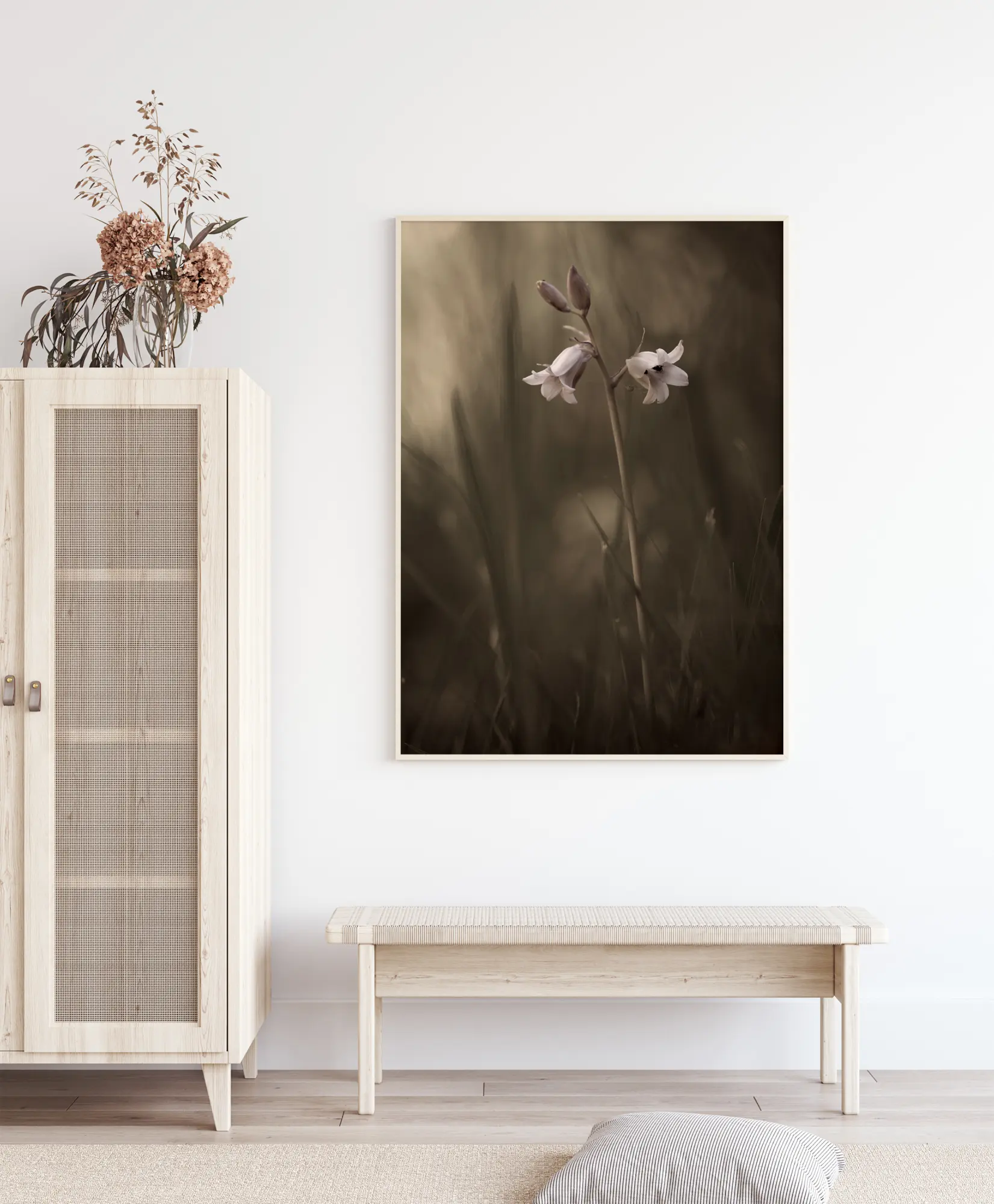Pehme plakat valge lillega häguse tausta ees. Valged ja roosad kellukesekujulised lilled on kontrastiks pehmele muruväljale taga. Kombineerige see lihtne rohelise tooniga plakat heleda seinaga, et lilled veelgi enam esile tõuseksid sellel diskreetsel plakatil.