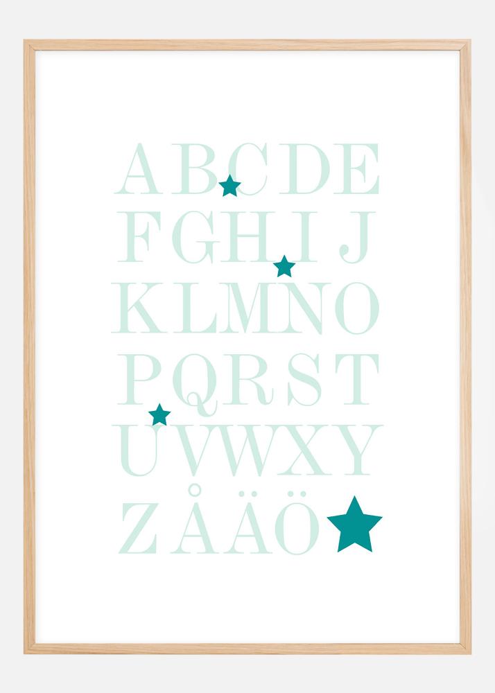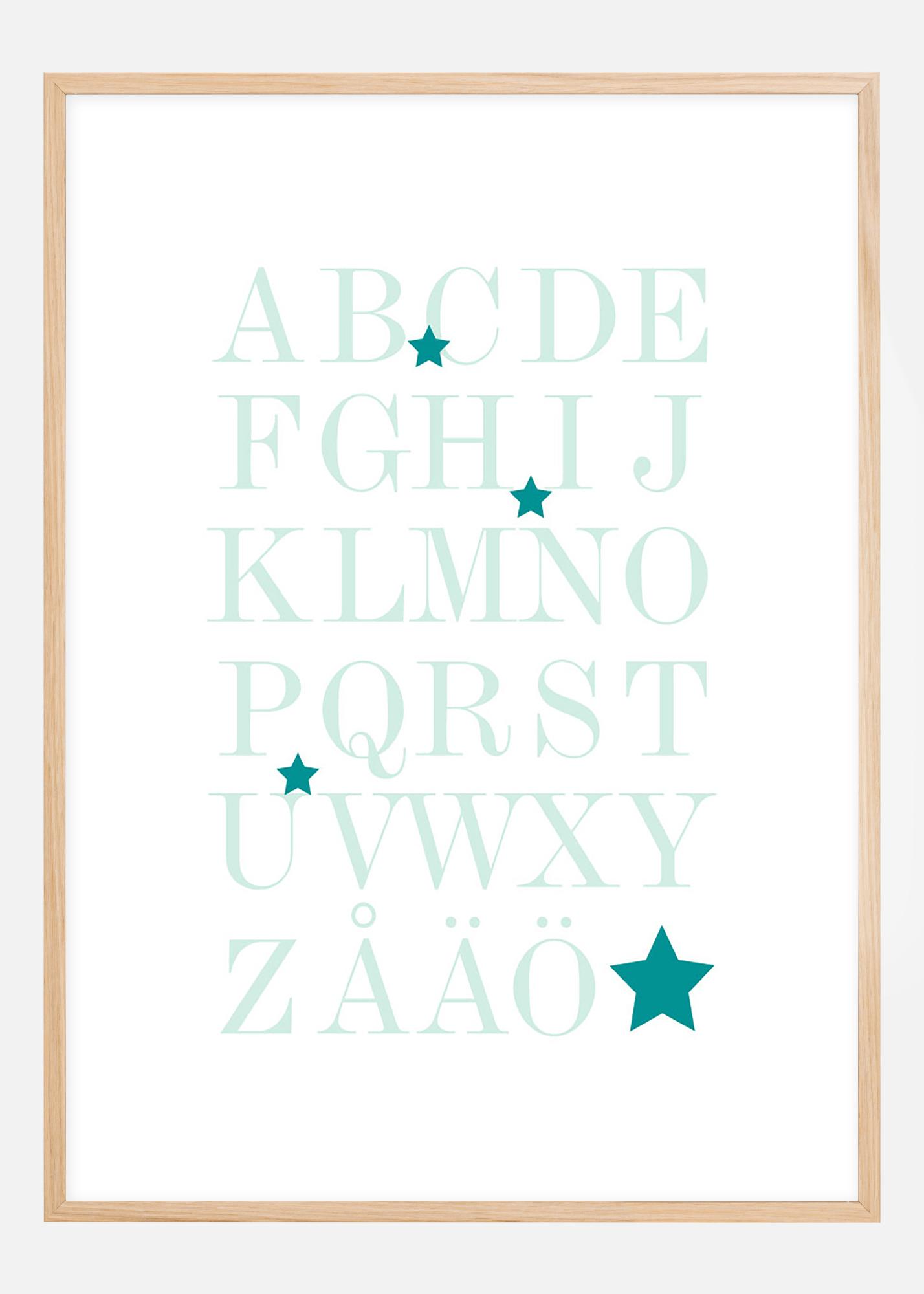 Graafiline trükk kogu tähestikuga, A-Ö, mererohelistes-türkiissinistes toonides. See pedagoogiline motiiv sobib hästi lastetuppa tähestiku harjutamiseks, kuid ka teistele pindadele kodus. Selle stiilipuhas väljendus muudab plakati sobivaks igasse sisustusstiili ja igat tüüpi koju. Kombineerige julgelt teiste piltidega, et luua teemaline pildisein või kaunistage sein koos 1-10 numbrite plakatiga.