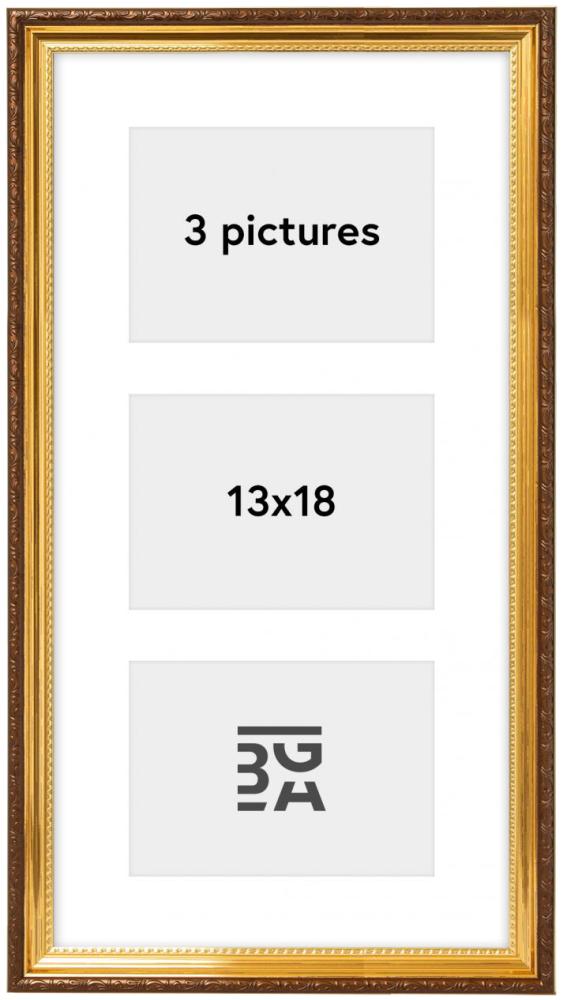 Selle kollaažraamiga saate kaunistada oma seina piltide, pere, sõprade ja meeldejäävate hetkedega elust. Raam mahutab 3 pilti suuruses 13x18 cm. Kullakarva raam on kaunis retrostiilis dekoratiivse soojapruuni värvusega välimise liistuga. Seinakinnitus on olemas.