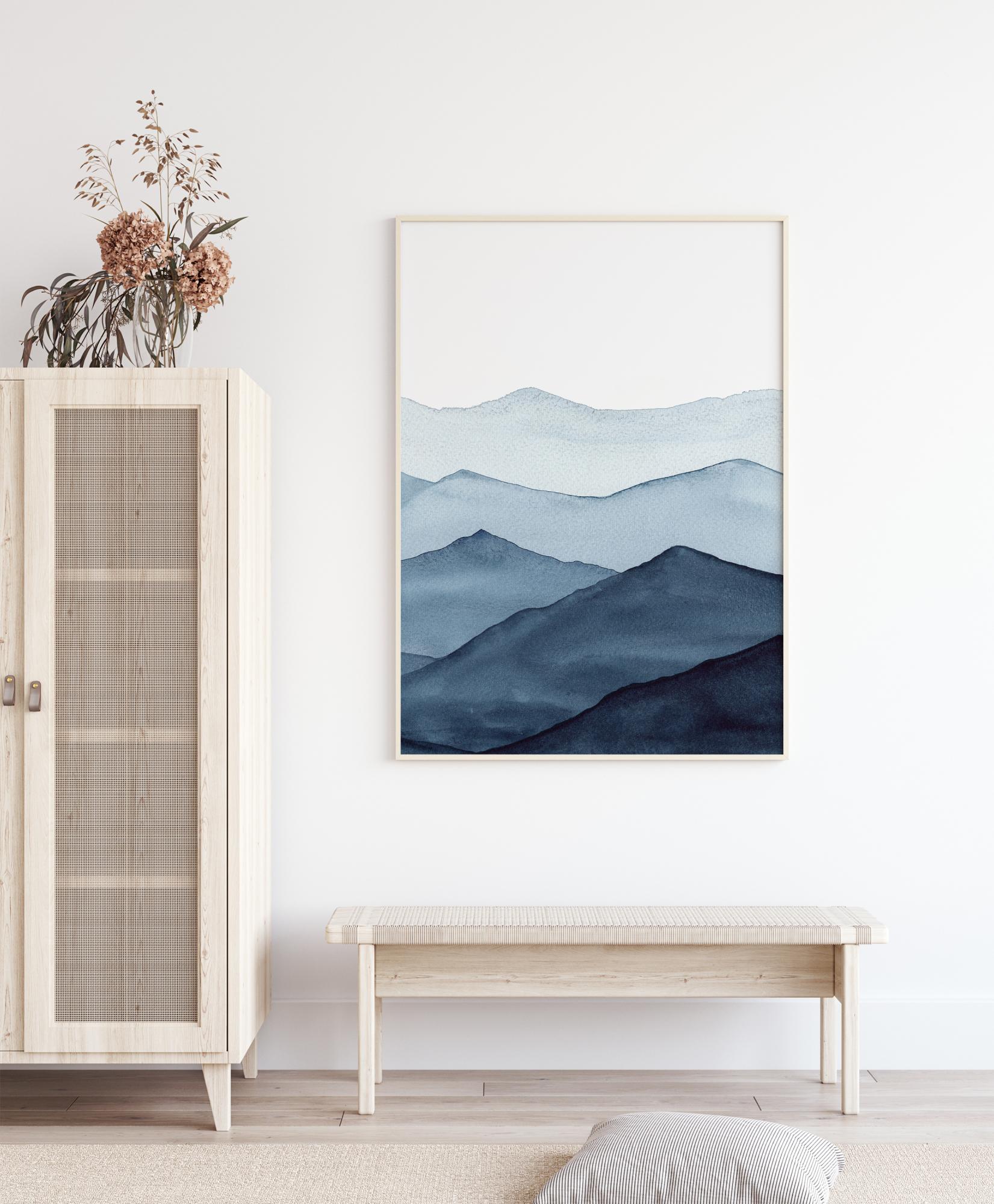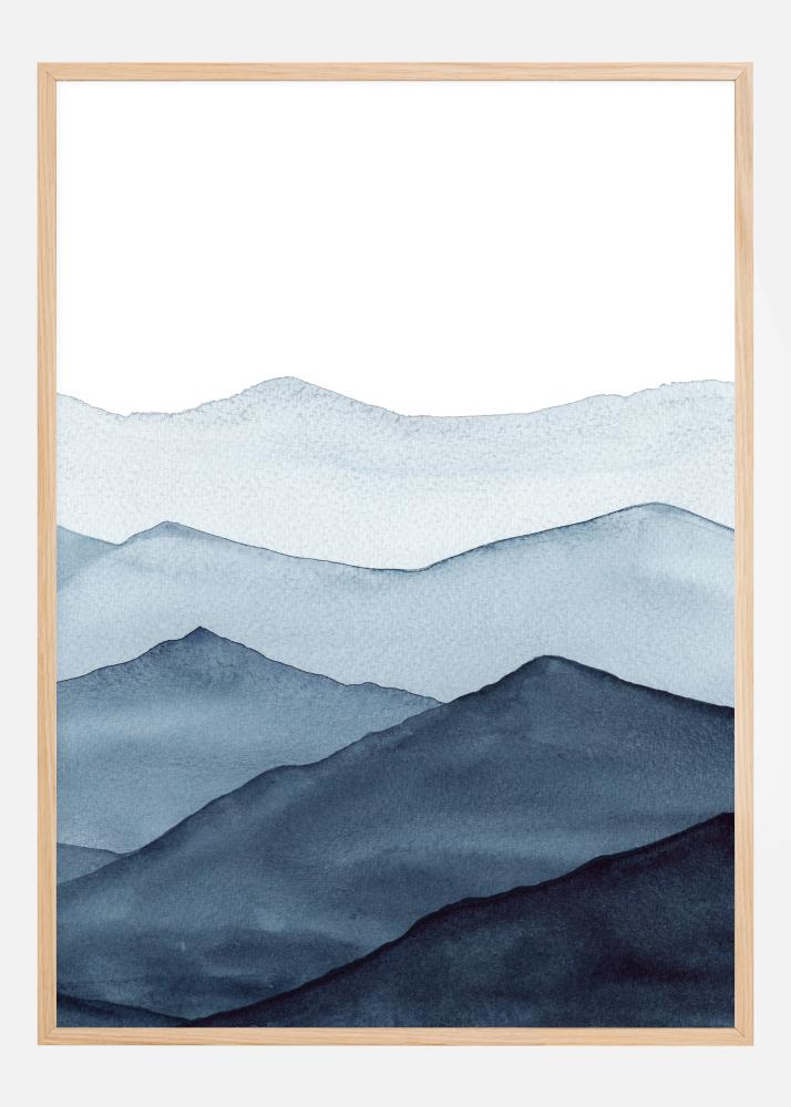 Fantastiline minimalistlik plakat siniste mägede reast. Lähim mägi on tumedas sinises toonis, kus värvid muutuvad kahvatumaks, kui mäed kaovad kaugusesse. Pehmed sinised värvid on ideaalsed jaheduse loomiseks, kuid kummalisel viisil ka rahustava õhkkonna loomiseks, kui sa vaatad kaugusesse.