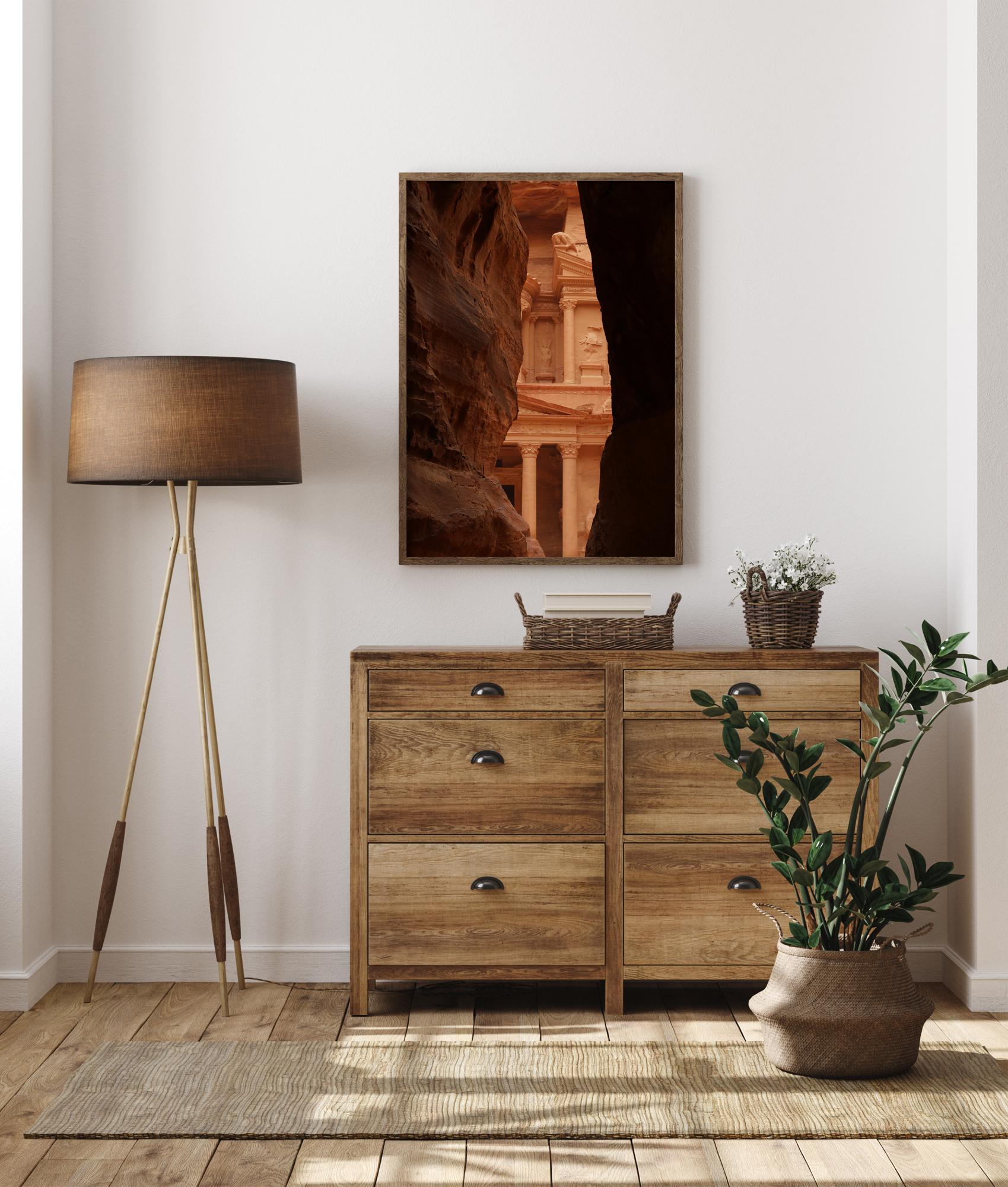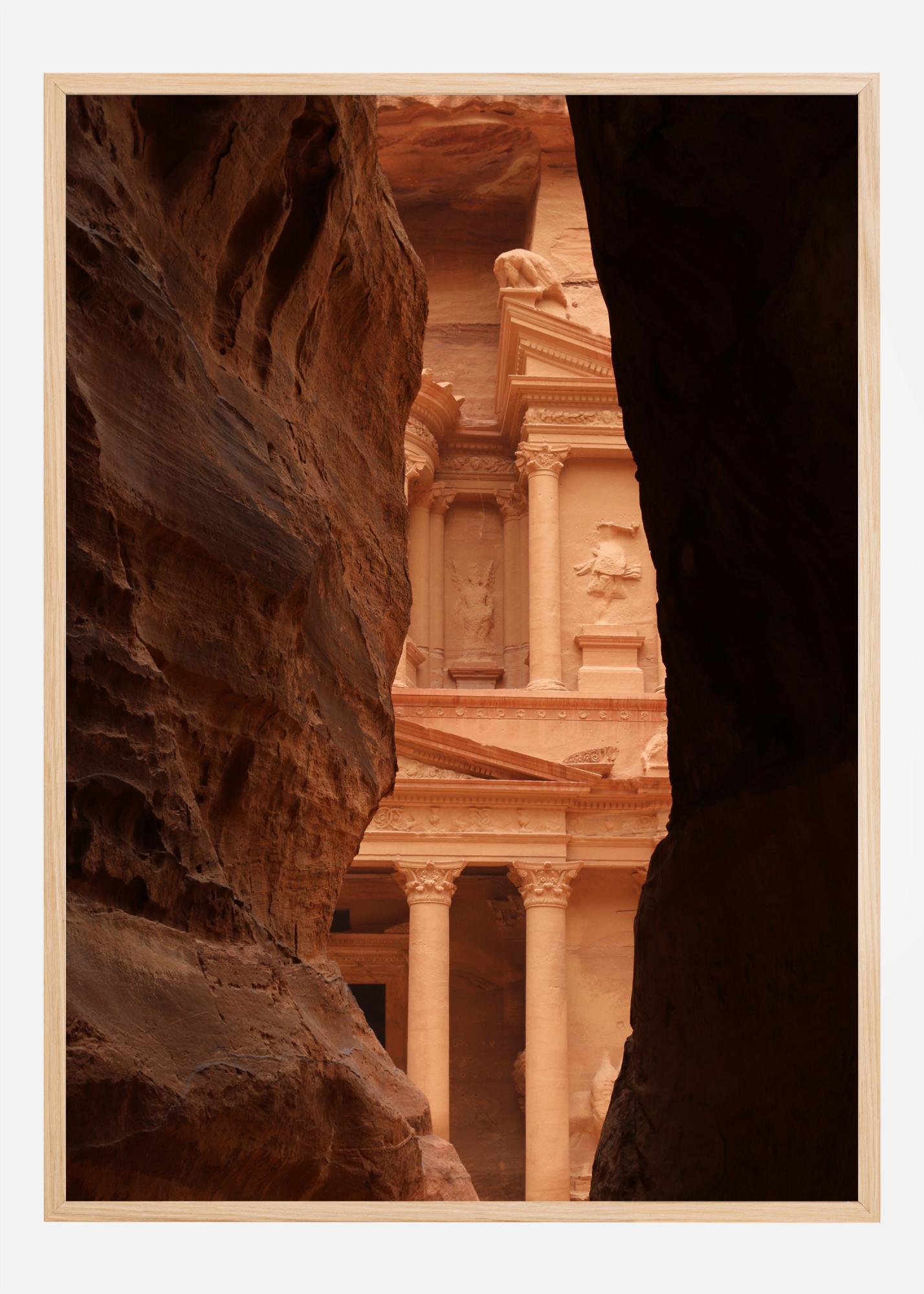 Petra, Jordaania nurgast tehtud maamärgi plakat. Vaadake fassaadi osa läbi punaste kaljude selle hämmastava antiikaja imetluse. Riputage see oma koju ja minge reisile ilma majast lahkumata, uurides selle kuulsa vana arhitektuuri.