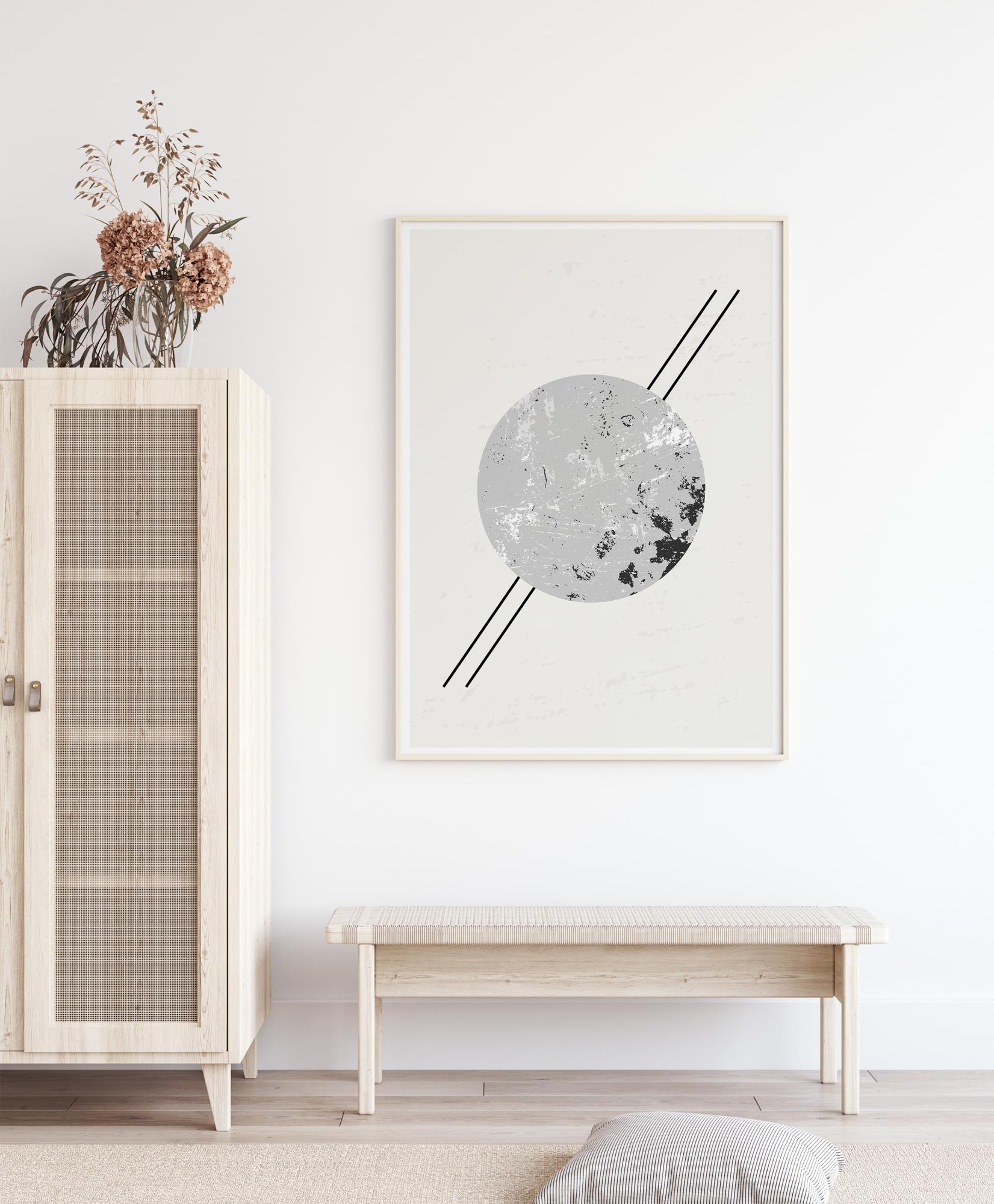 Abstraktne plakat, millel on ring, millest jooksevad läbi kaks sirget joont. Ringi pehmed hallid toonid on kontrastiks tumehalli ja valge marmorefektiga, mis peaaegu näeb välja nagu Maa kosmosest. Muutuge mõtlikuks, kui see on riputatud pastellvärvidega seintele.