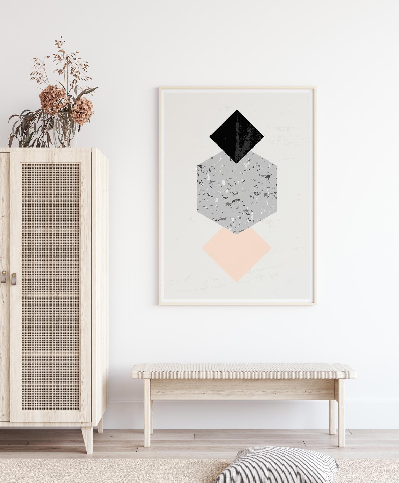 Geomeetriline abstraktne poster kahe erineva ruuduga. Kuigi need on kahemõõtmelised, loovad ruutude nurgad kuubikute illusiooni. Need kuubikud on täidetud lõbusate kivide ja värvilaikudega sinises, hallis ja mustas. Loo dramaatiline sein, kui sobitad selle lihtsa teose julge värviga seinaga.