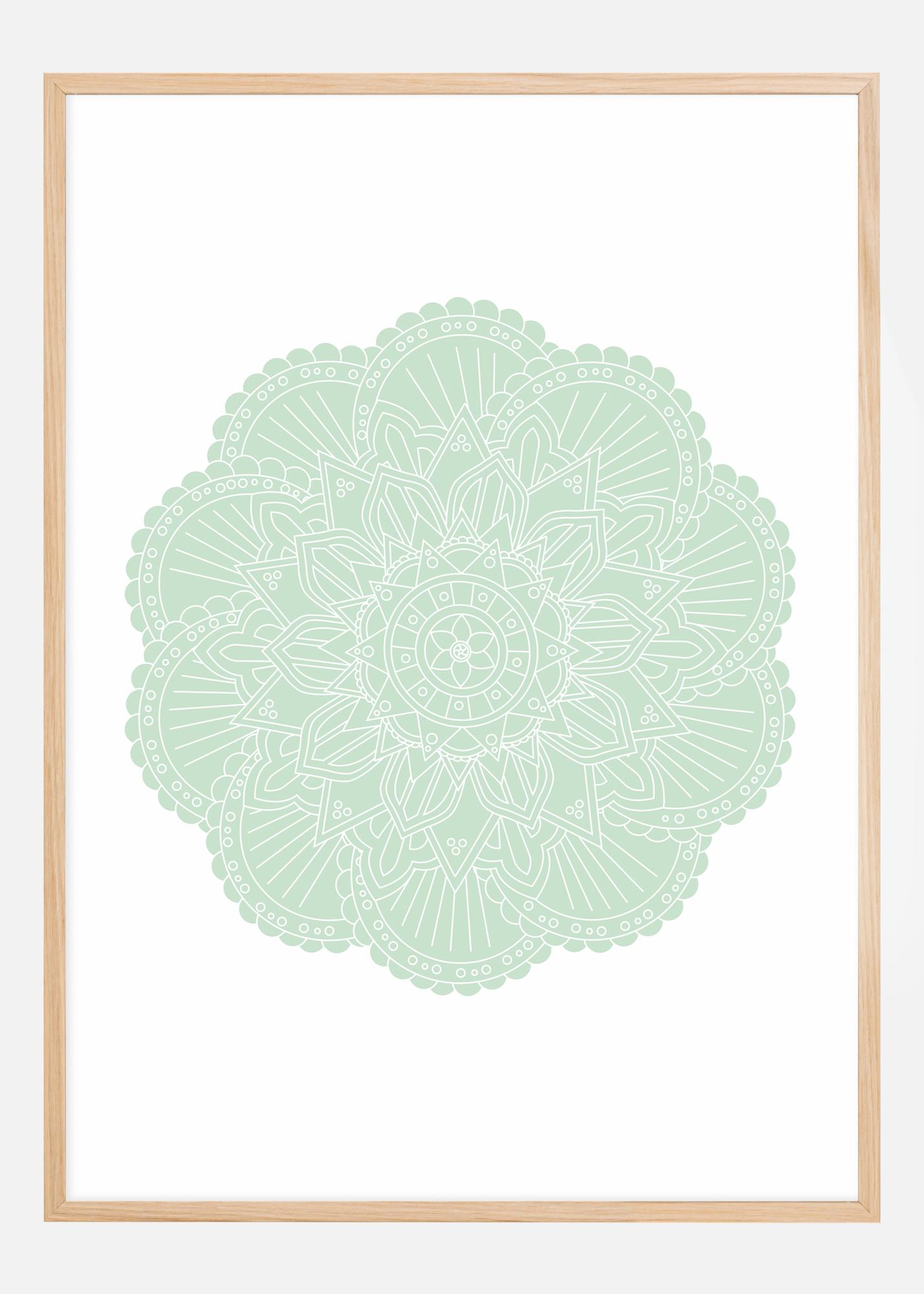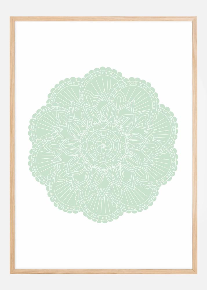 See plakat kujutab sümmeetrilist mandalat lõõgastavates rohelistes toonides, pilt, mis on nii visuaalselt köitev kui ka sümboolselt rikas. Mandala, tuntud oma kasutamise poolest meditatsioonis ja lõõgastumises, pakub keerulist mustrit, mis kutsub silma uurima ja meelt rändama. Pehmed toonid aitavad kaasa tasakaalu ja harmoonia tunnetele, muutes selle kunstiteose täiuslikuks raamiks mõtisklemiseks ja rahuks.