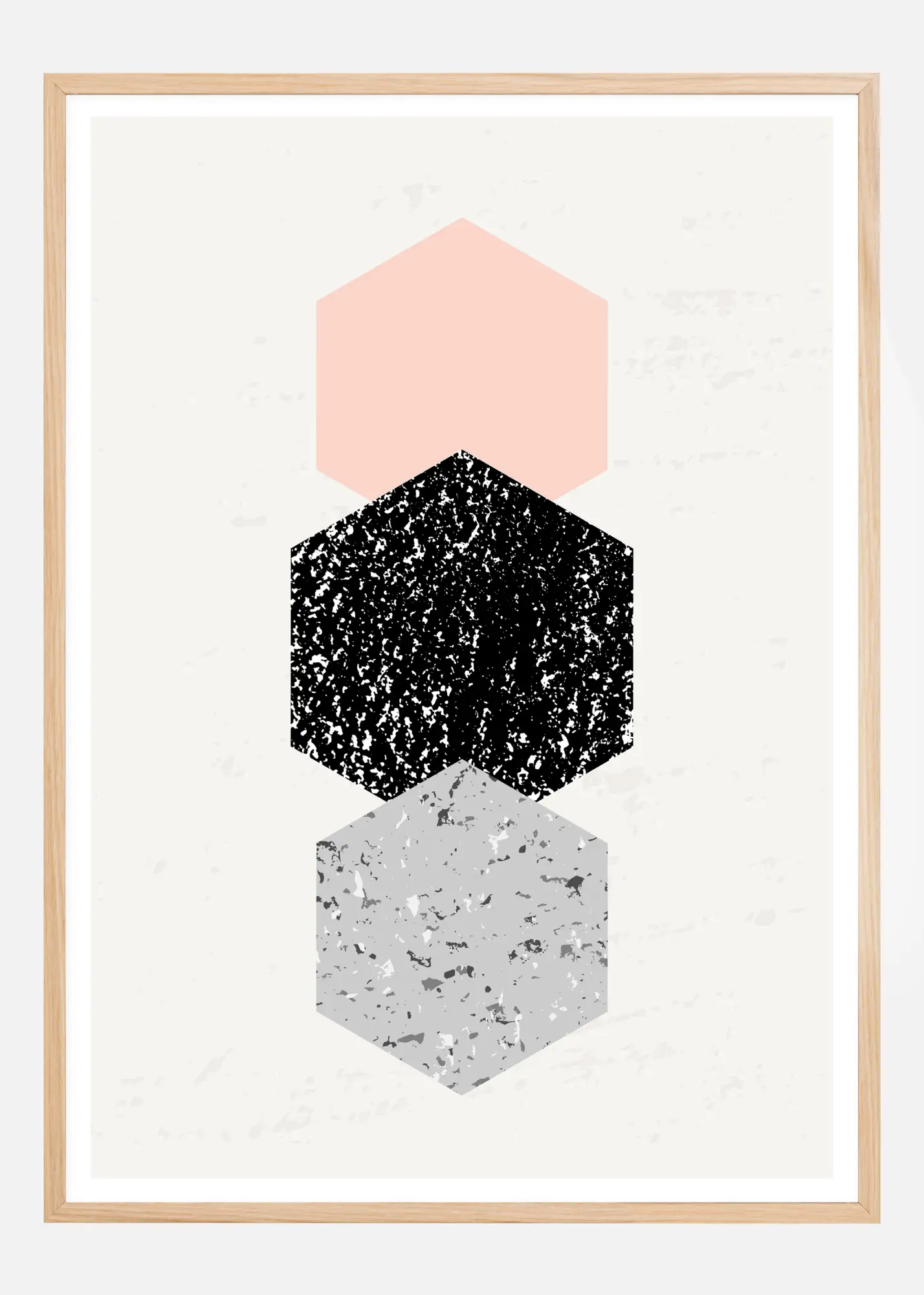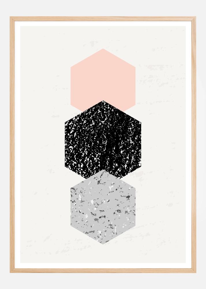 Abstraktne plakat kuusnurkadega, millel on kolm üksteise peal olevat kuusnurka. Ülemine on õrnalt roosa, keskmine suurem on must-valge täpiline kuju ja alumine on sinine marmorjas kuusnurk. Silm järgneb selle teosele, ilma häirimata - ideaalne kodukontorisse.