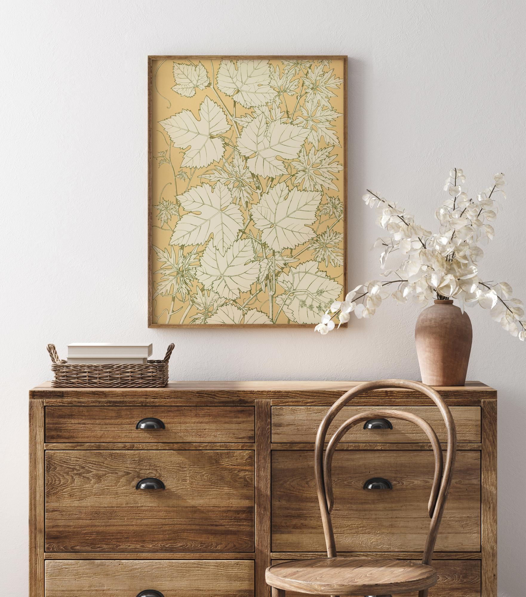 Loodusplakat lehtedega pastelsetel oranžil taustal. Lehed on joonistatud musta tindiga ja ilma värvita, mis paneb need ühevärvilise tausta vastu trükimustrina esile tõusma. Elavda siledat seina kodus selle lihtsa trükistiilis kunstiga, kui tood koju tüki loodust.
