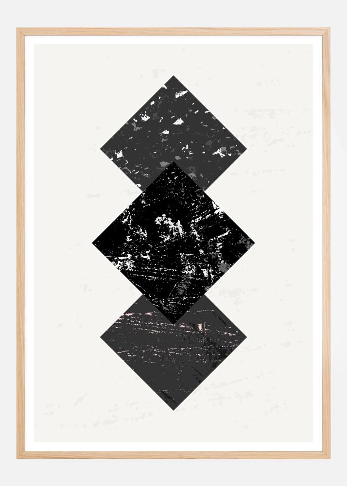 Geomeetriline plakat kolme tumeda ruuduga, mis asetsevad oma tippudel. Kaks tumesinist ruutu asetsevad üleval ja all suuremale mustale ruudule. Kõik on esile tõstetud valgete täppide ja laikudega, et luua huvitav mustrite komplekt. Sobita see kunstiteos sinise seinaga ja lase kujudel esile kerkida.