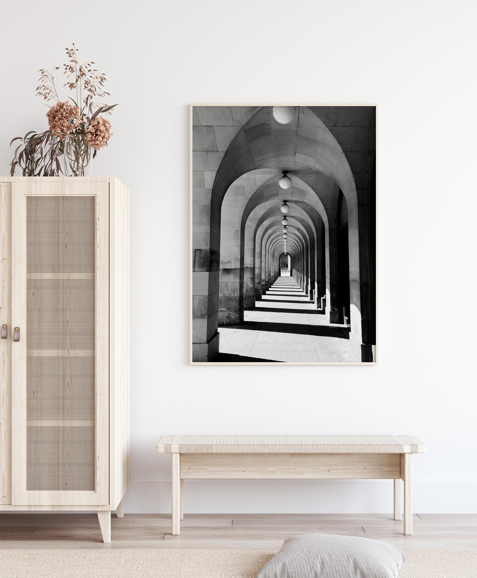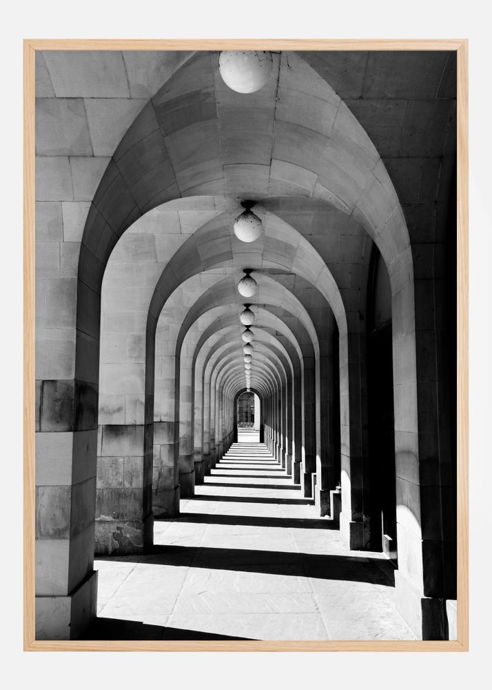 Interjöörplakat pika võlvkäiguga koridorist. Iga võlv suunab pilgu allapoole mööda koridori, kui see kauguses kaob. Hallid toonid toovad esile igal võlvil olevad varjud valguse käes. Saavuta tunne, et tuba muutub suuremaks, kui sa selle üles riputad ja pilguga koridori jälgid.