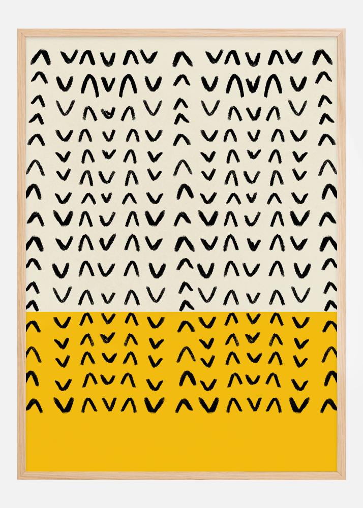 Kogege moodsat ja minimalistlikku esteetikat selle kunstilise postriga. Disain esitleb rütmilist koosseisu abstraktsetest, mustadest pühkivatest vormidest pehme, neutraalse tausta vastu. Motiiv on teravalt jaotatud jõulise kollase osaga alumises kolmandikus, mis lisab julge kontrasti valdavalt rahulikule ja harmoonilisele ülemisele osale. See plakat on ideaalne trenditeadlikule inimesele, kes soovib oma koju või kontorisse tuua kaasaegse ja stiilse tunde.