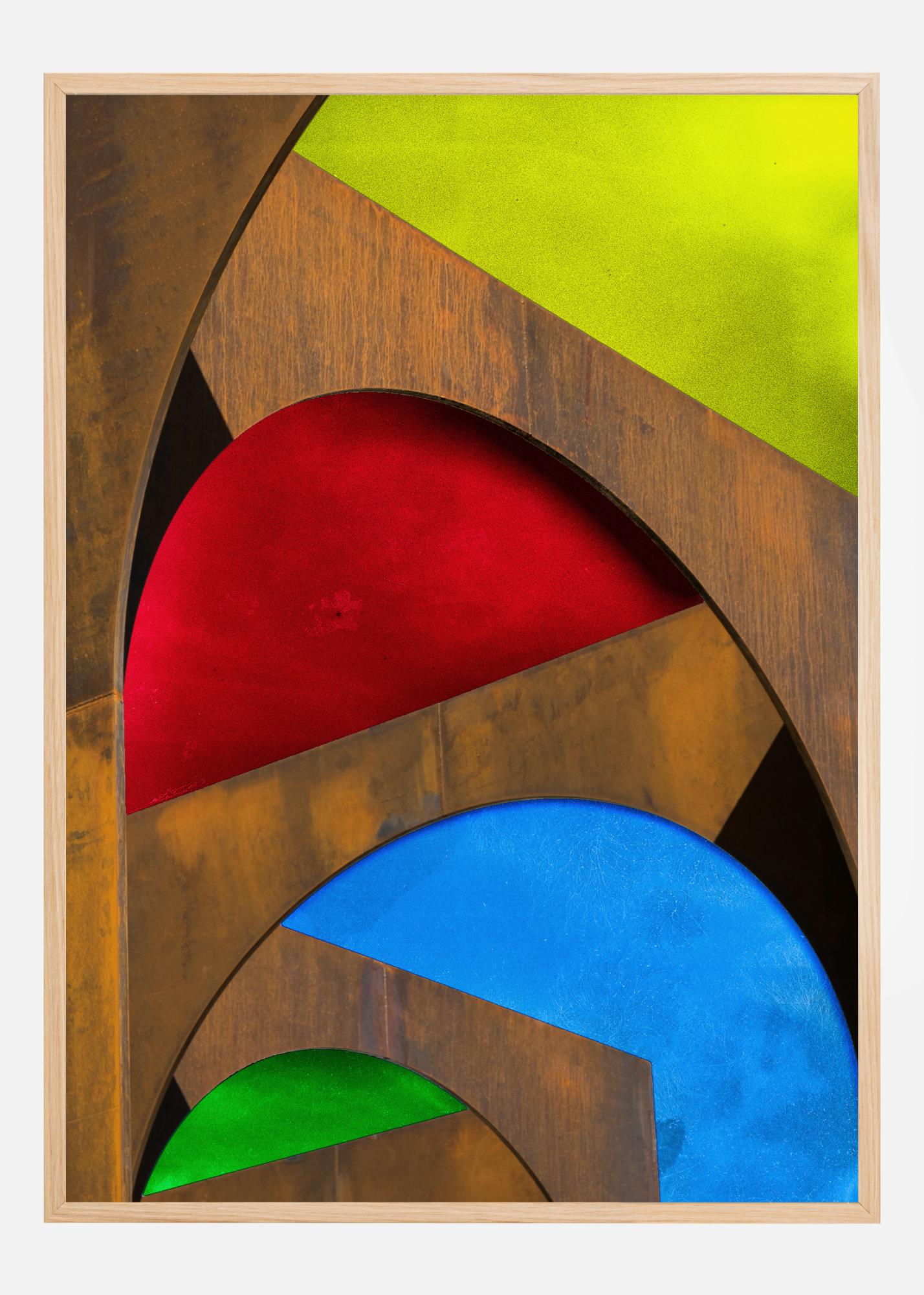 Valge abstraktne plakat värviliste kujunditega. Põhivärvid täidavad selle teose punaste, kollaste ja siniste poolringikujuliste kujunditega. Need kujundid on ühendatud sirgete puulõigetega musta vastu. Too elu igavale ja siledale seinale või sobita teise olemasoleva julge värviga, et teost täiendada.
