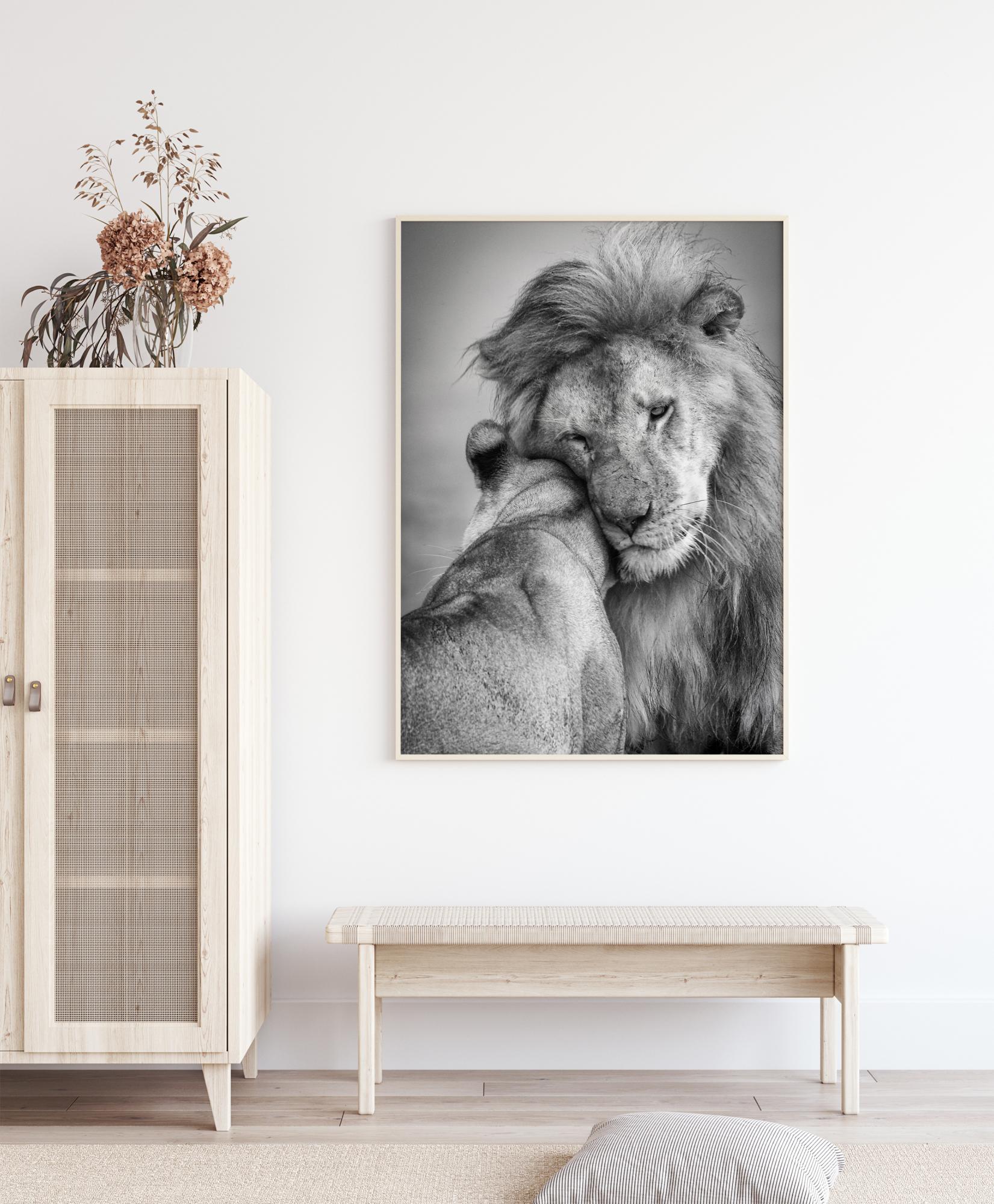 Loodusplakat, millel on lõvi ja lõvinaine õrnas hetkes. Sellel suurepärasel mustvalgel pildil näed lõvisid, kes embavad teineteist, kui lõvinna lamab seljaga tema vastu. Koge armastust selles soojas embuses iga kord, kui hommikut alustad.