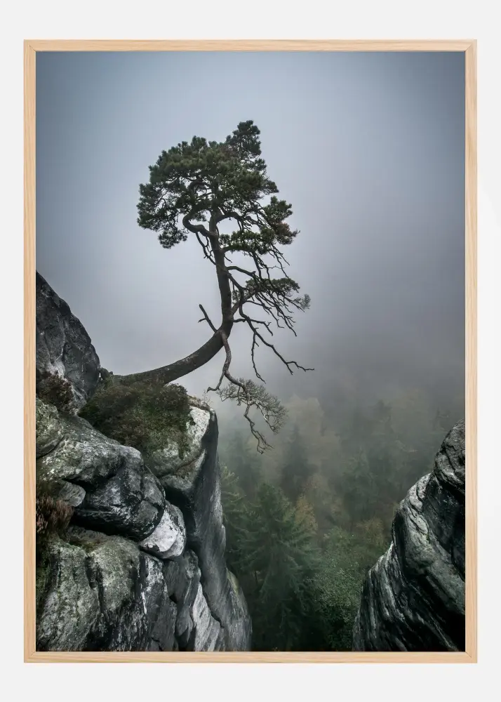 Dramatiline loodusplakat keerdtreest, mis kasvab kaljuseina küljel. Täisvärvides paindub puu hallide kaljude vahel oleva kuristiku kohale. Alumisel serval on näha udune mets ja valgus toob esile puu klammerduvad oksad. Too loodusdraama oma koju, kui ostad selle teose.