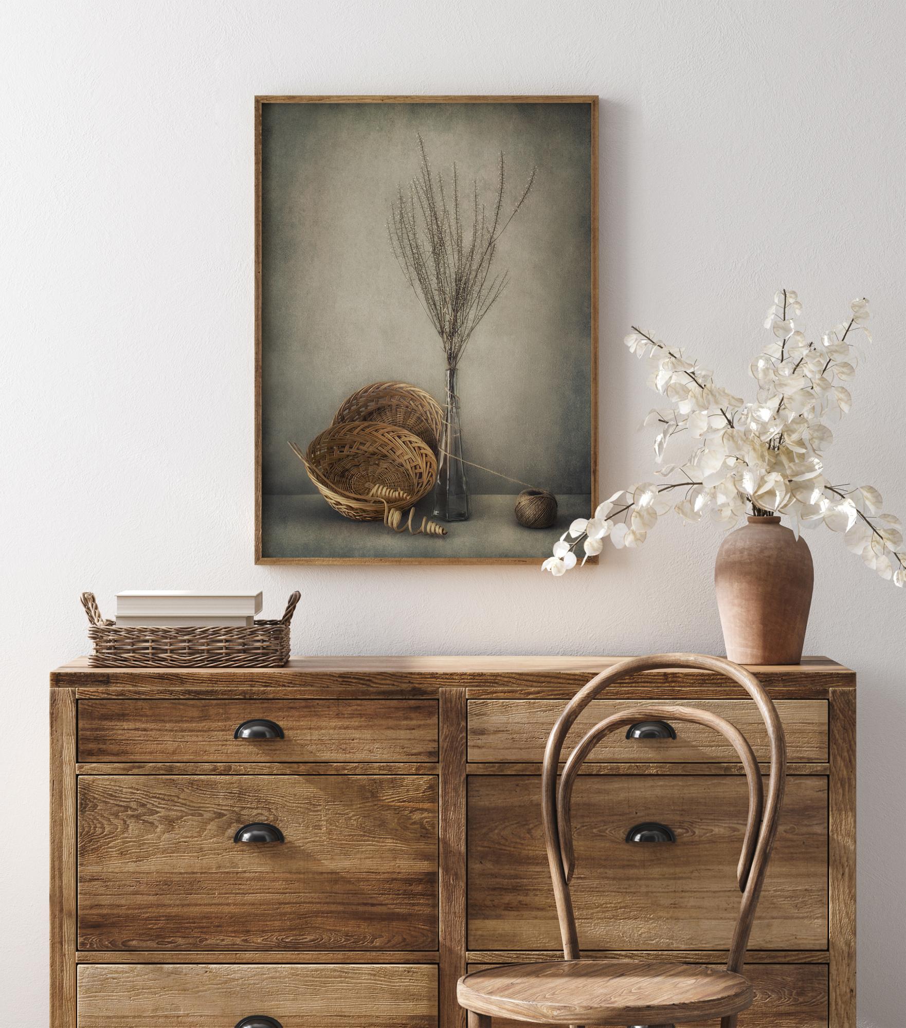 Vaikelu poster korvide, savipoti ja kuivatatud rohuga klaaspudeliga. Sellel teosel on peened seepiatooni ja halli varjundid, mis moodustavad pehme ja harmoonilise teose. Too koju veidi rahu selle postriga ja kombineeri see neutraalse seinaga, et see ei domineeriks liiga palju.