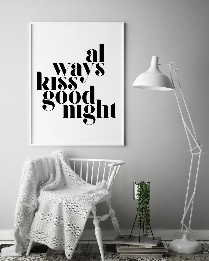 Tekstiplakat sõnumiga, mis muudab. Anna endale positiivne sõnum õhtul või päeval, kui vaatad seda Always Kiss Goodnight-plakatit oma seinal. Kombineeri see julge taustaseinaga, et inspireeriv sõnum sind kõnetaks.