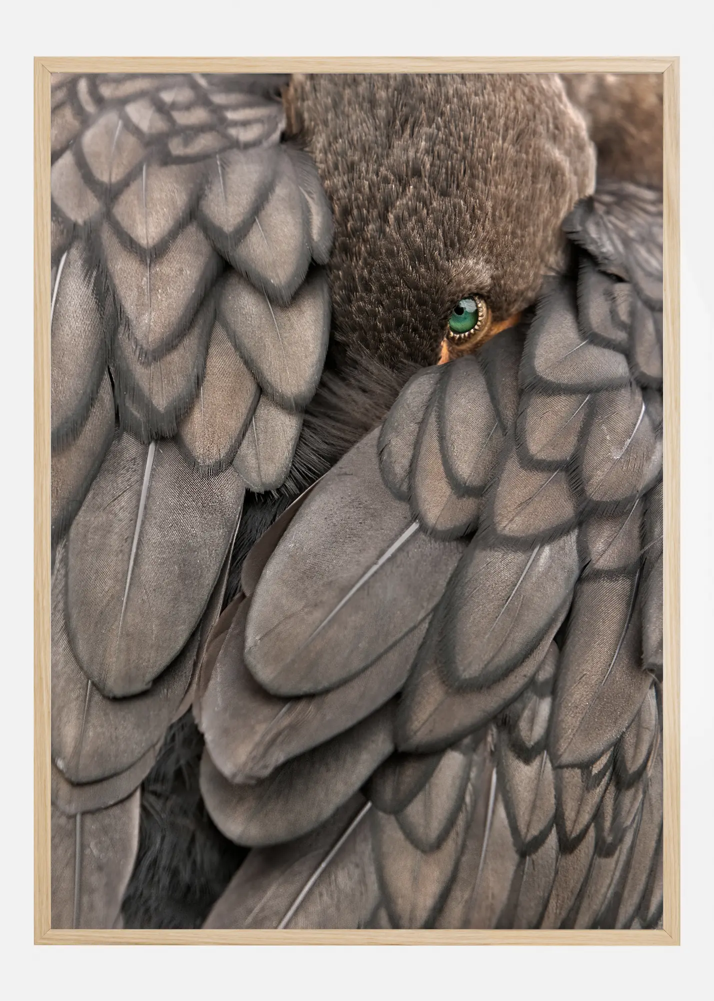 Seda kütkestavat plakatit jäädvustab looduse intiimsust, mille lähivõttes on lind, mille särav roheline silm särab nagu smaragd, mis on sulgede hallide toonide vahel. Iga sulg on kujundatud täpselt, kutsudes esile linnu elegantse kuju ja struktuuri tunde. See on teos, mis kõnetab nii linnusõpru kui ka kunstnikke ning neid, kes hindavad looduse peent ilu.