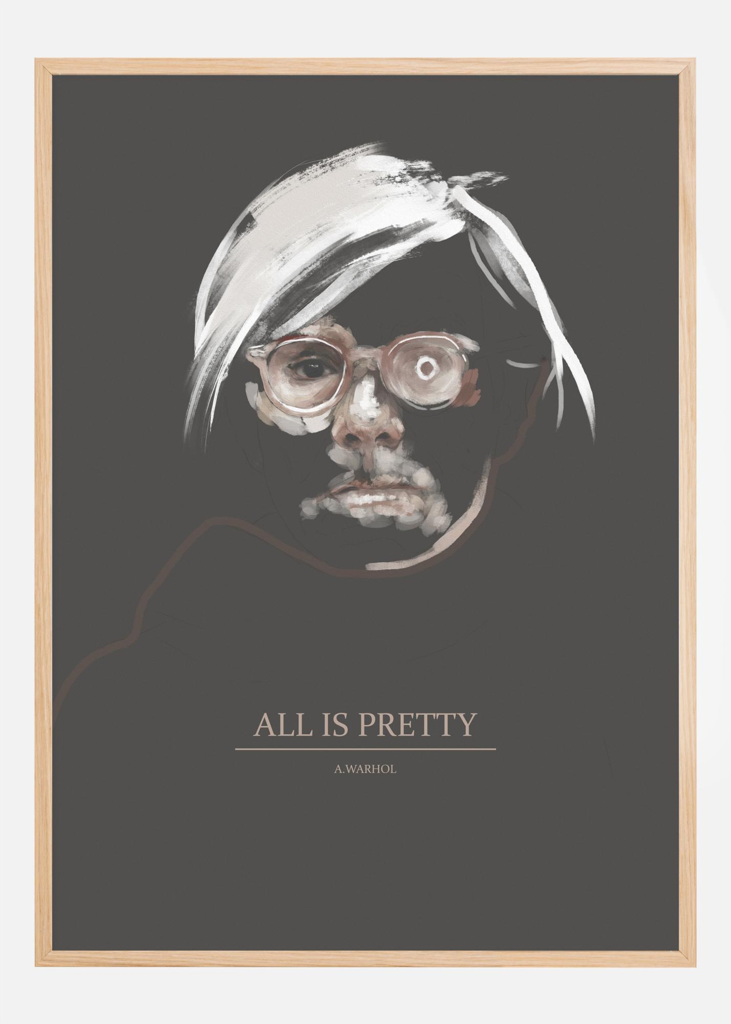 Kunstnikuplakat Andy Warholilt. See kunstniku portree näitab tema valgeid juukseid ja keskendub tema silmadele, üks rahulik ja teine metsik. Allosas on loosung - All is Pretty – et anda sulle inspireeriv tsitaat ja sõnum, kui möödud plakatist, mis ripub sinu kodus.