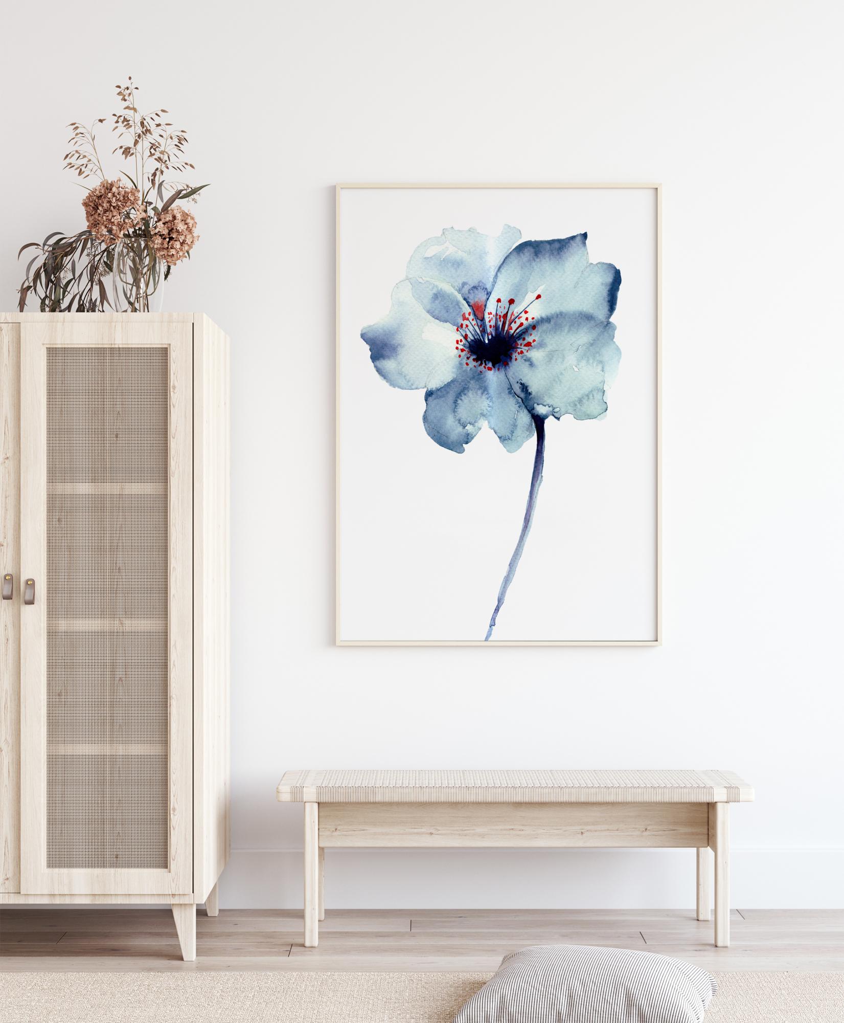 Majesteetlik lill, mis on maalitud sinise ja punase akvarelliga. Kaunis plakat kogu oma lihtsuses, mis sobib nii kööki, esikusse kui ka elutuppa või magamistuppa.