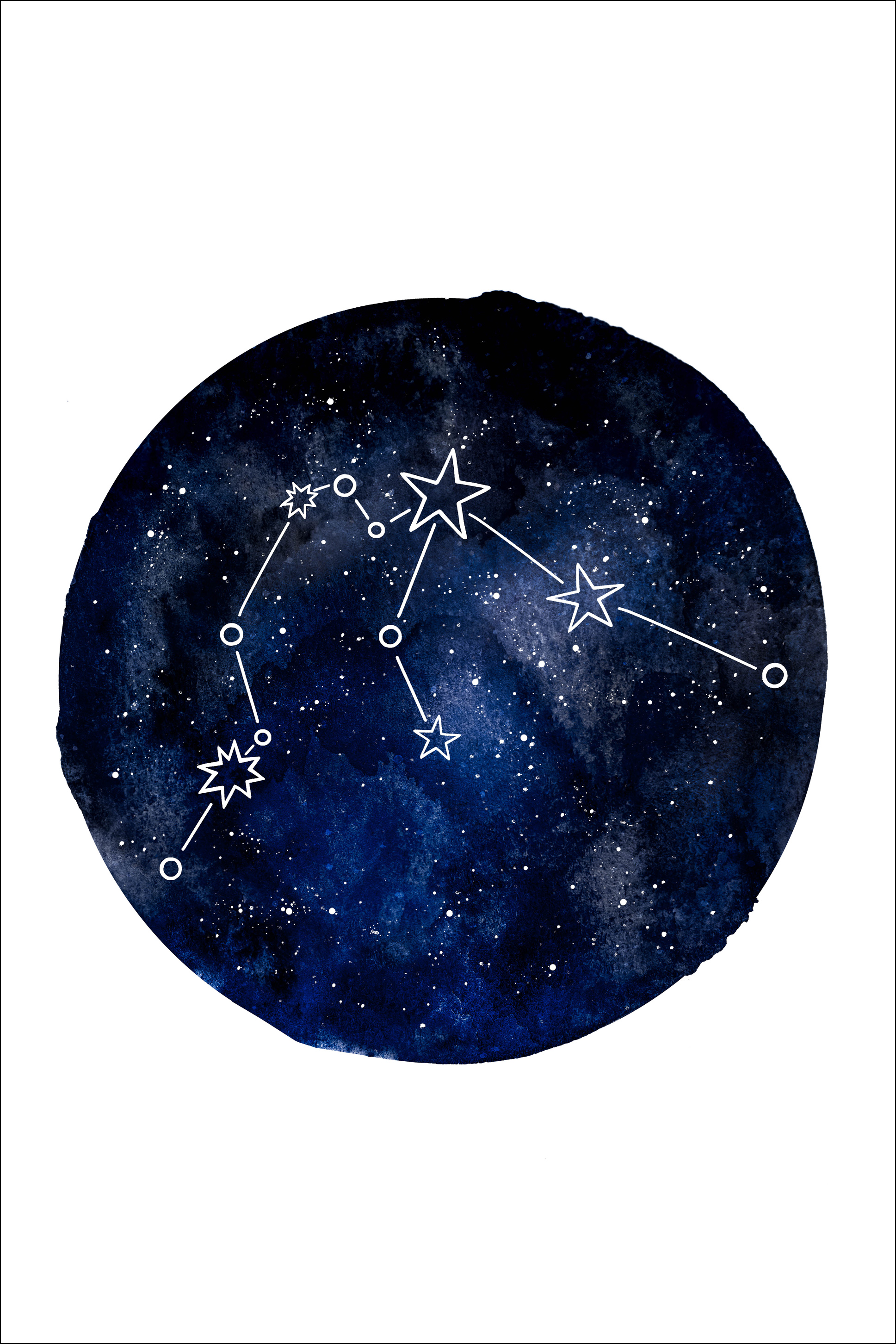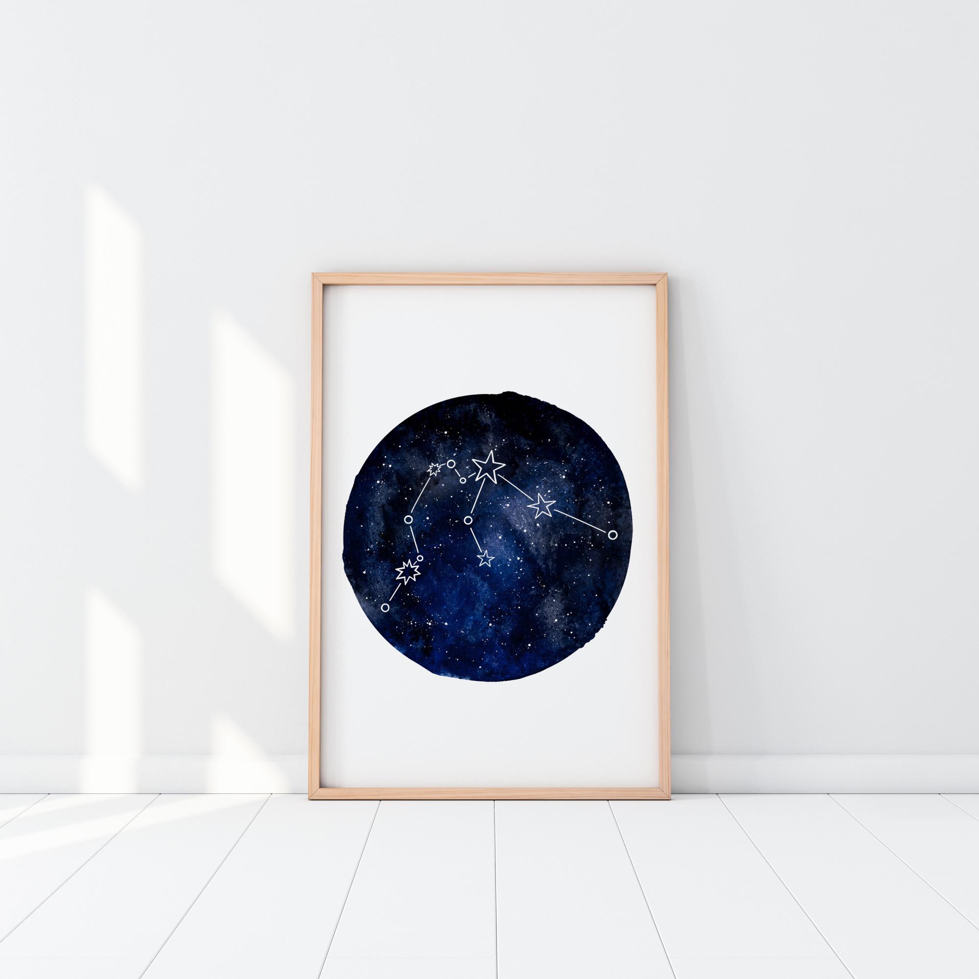 Abstraktne plakat sodiaagimärk Veevalajaga. Riputatud tumesinine gloobus galaktika pildiga, mis tõstab esile sodiaagimärgi. Gloobus liigub lihtsa valge tausta poole. Riputa see üles ükskõik millisele seinale kodus, et saaksite sodiaagimärki öötaevas näha.