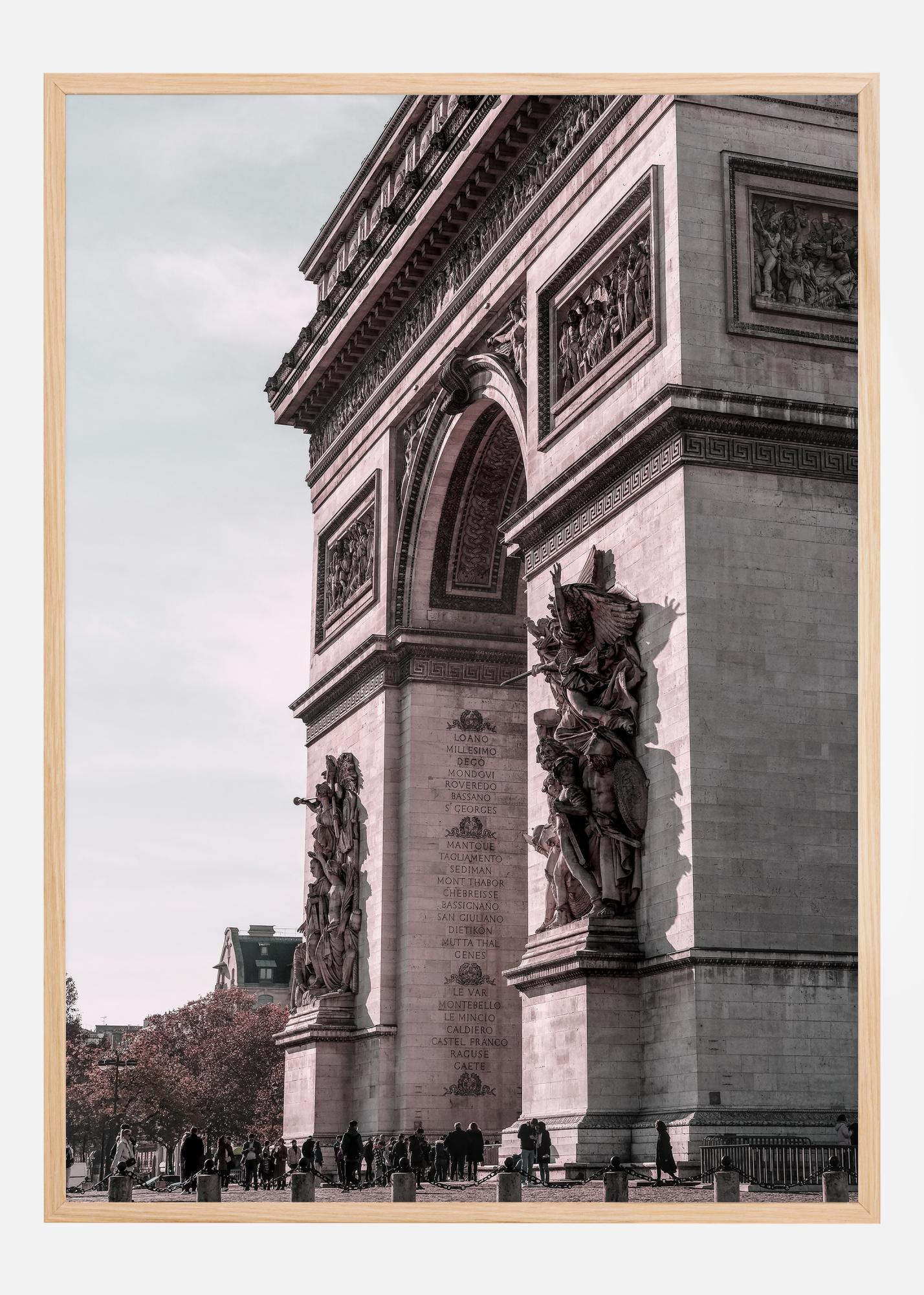 Selle elegantse plakati keskmes on Pariisi triumfikaare majesteetlik ja detailirikas arhitektuur. Selles unikaalses prindis on jäädvustatud kuulsa maamärgi suursugusus ja detailirohkus, alates võimsatest skulptuuridest, mis kaunistavad selle sambaid, kuni peente ornamentide ja graveeringuteni, mis jutustavad selle ajaloolisest tähendusest. Kergelt roosakas toon loob sooja atmosfääri, kusjuures pilt on austusavaldus Prantsuse ajaloole ja arhitektuurile ning muutub kultiveeritud täienduseks iga kunsti- ja plakatikollektsiooni.