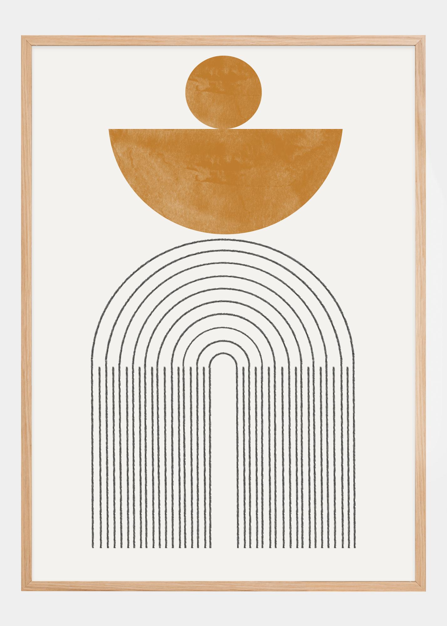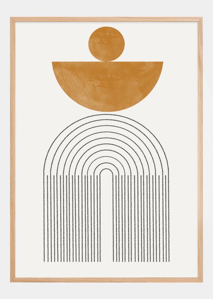 See elegantne plakat ühendab orgaanilised vormid ja puhtad jooned kompositsioonis, mis on nii rahustav kui ka visuaalselt huvitav. Suur ohravärvi poolring istub nagu loojang kaarte seeria kohal, luues arhitektuurilise ruumi- ja sügavusetunde. Ülaosas tasakaalustab kujundust väiksem ring, mis meenutab päikese teekonda üle taeva.