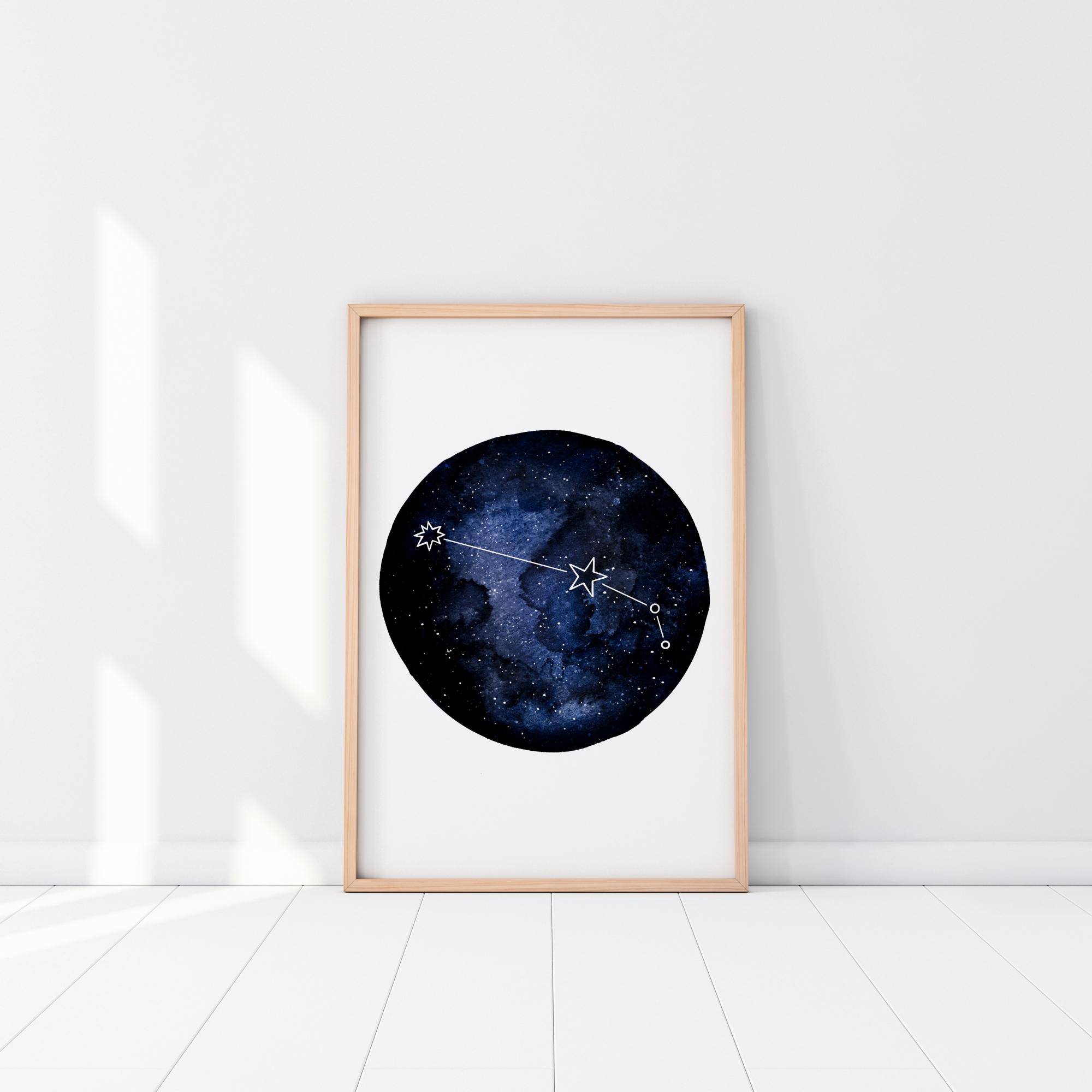Abstraktne plakat Jäär tähtkujust. Rippuv tumesinine gloobus galaktika pildiga ning tähtkuju kontuuriga. Gloobus liigub tavalise valge tausta suunas. Riputage see oma koju seinale ja vaadake, kas suudate selle tähtkuju öisel taeval avastada.