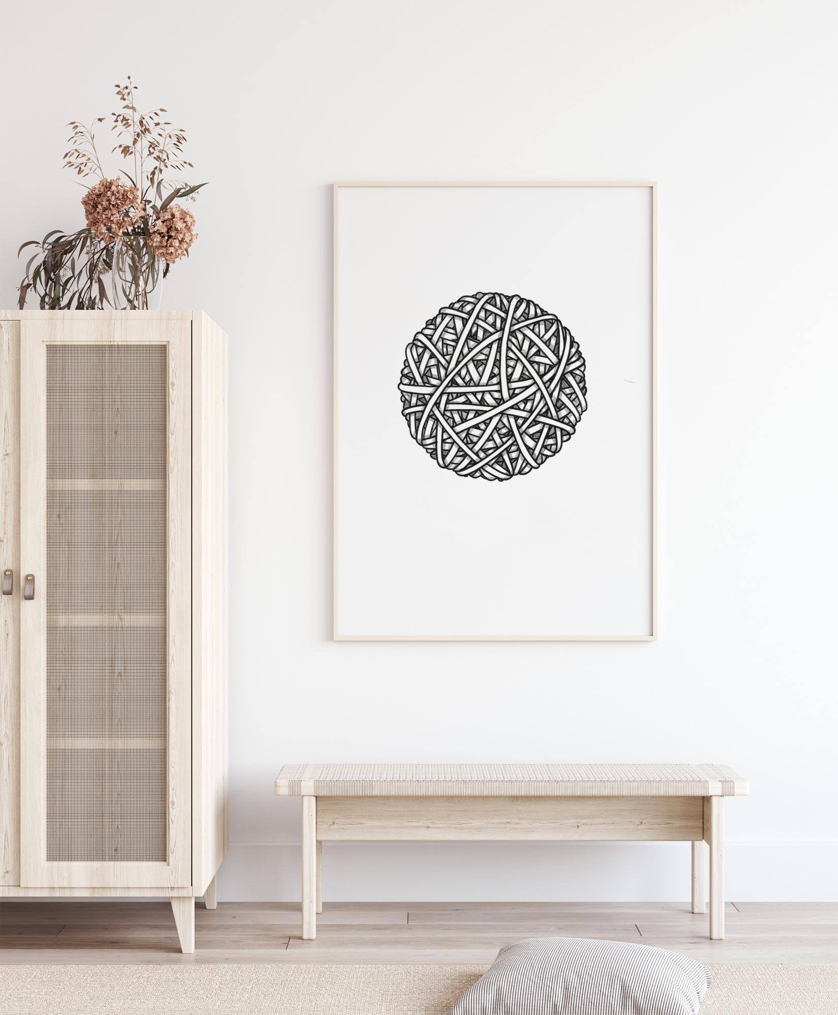 Graafiline poster mustvalgena keritud palliks. Lihtne ja minimalistlik pilt, mis sobib suurepäraselt segamiseks teiste suurepäraste lemmikutega suuremas kollaažis.