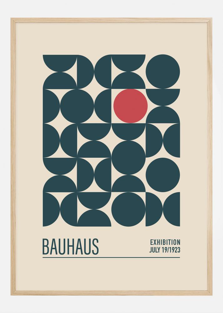 See poster hõlmab Bauhausi liikumise minimalistlikku olemust ja selle rõhku geomeetriale ja värvile. Graafiline kompositsioon koosneb kattuvatest ringidest erinevates sinistes toonides, millele lisandub erksav punane ring, luues dünaamilise ja samas tasakaalustatud visuaalse kogemuse. Tekst "BAUHAUS EXHIBITION JULY 19/1923" viitab ajaloolise disainikooli näitustele, mis olid murrangulised kaasaegse disaini jaoks.