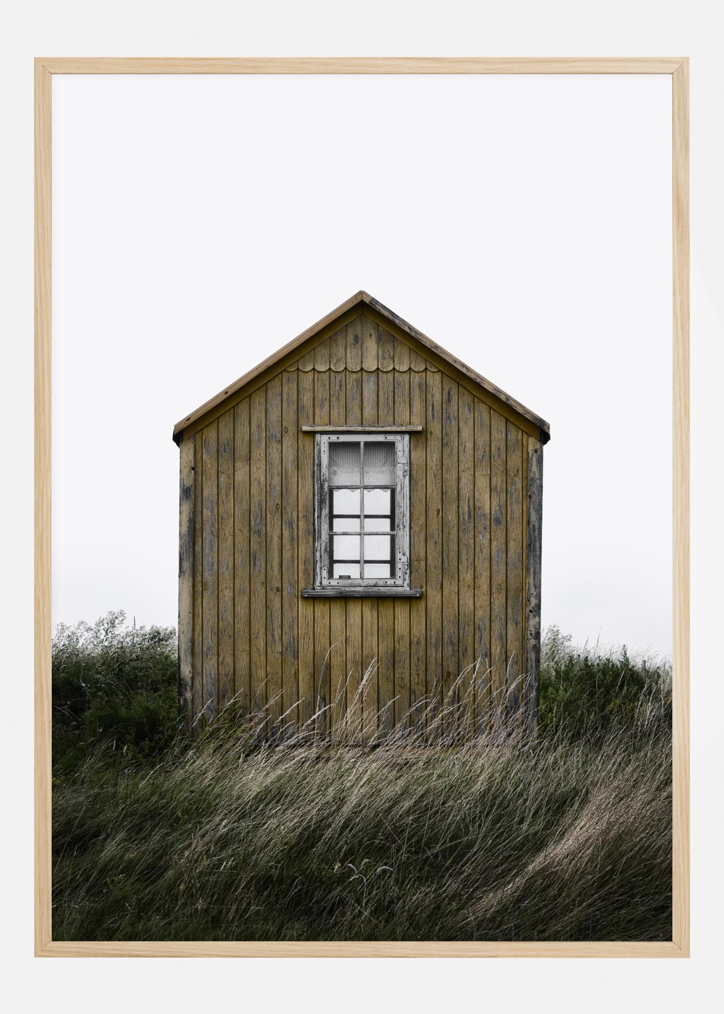 Elegantne maastikufoto koos lihtsa puidust rannamajaga. Üksildane majake seisab tuulise liivaseljandiku ja rohu peal. Tundke seda avarust ja vabadust, kui riputate selle oma koju üles.