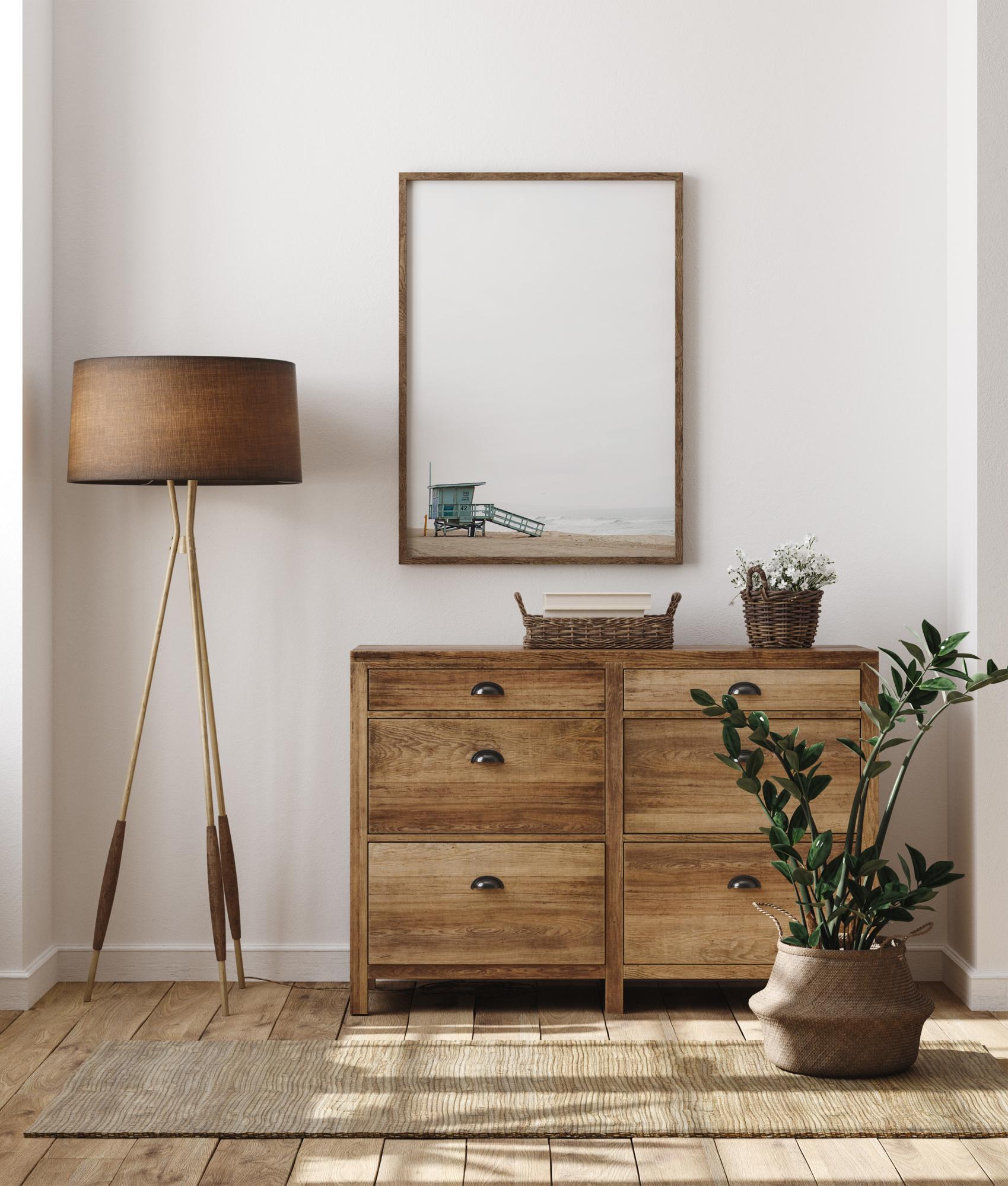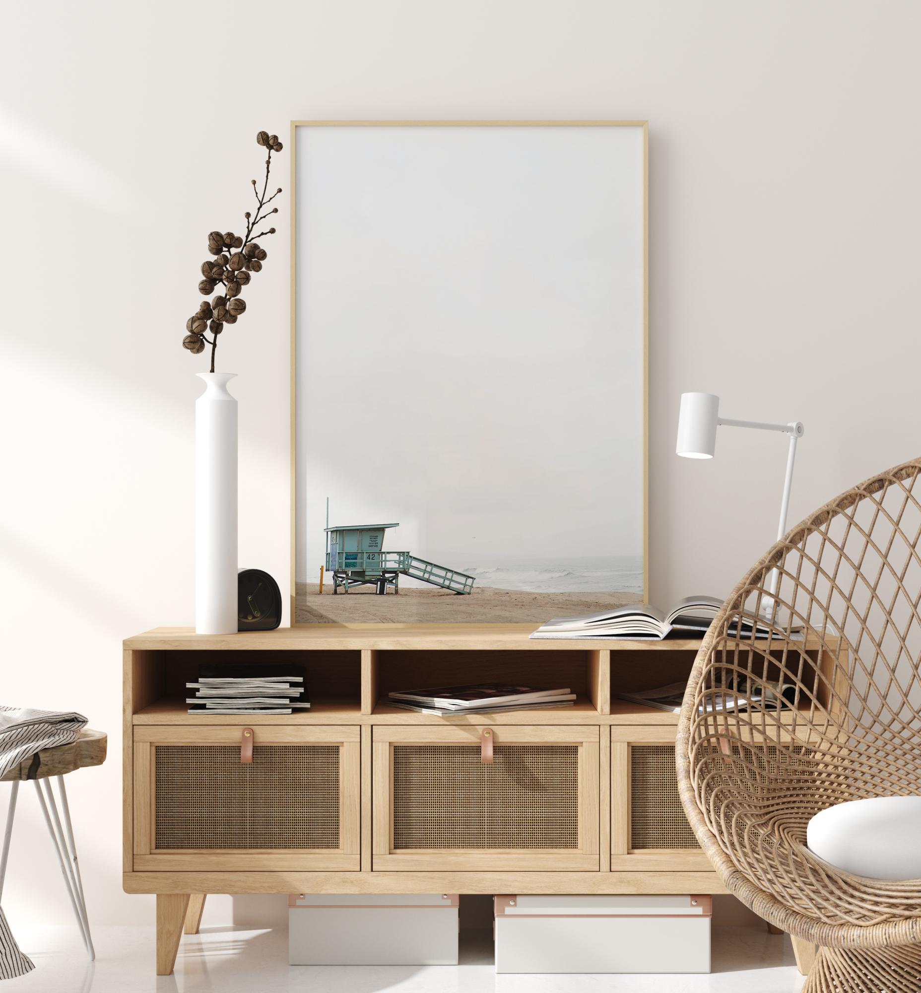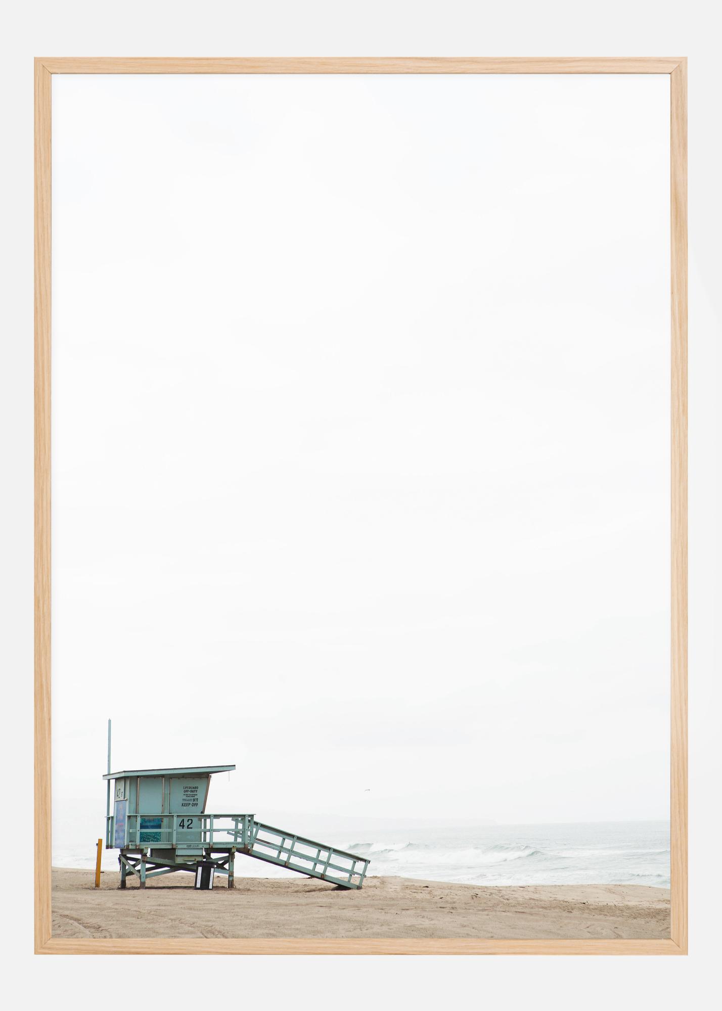 Minimalistlik poster vetelpäästekabiinist rannaserval. Valge taevas laieneb kõrgele kabiini kohale, tekitades väiksuse tunde, samal ajal kui kabiini ramp suunab pilgu merre. Loo avaruse tunne, kui riputad selle pildi seinale.