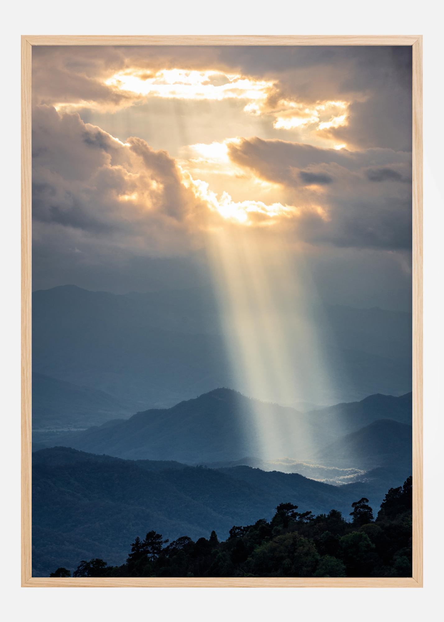 See inspireeriv plakat kujutab majesteetlikku maastikku, kus päikesekiired murravad läbi pilvede ja valgustavad voogavaid mägesid. See on stseen, mis püüab looduse ülevat ilu, dramaatilise taevaga, mis on kontrastiks pehmelt kontuuritud mägedele. Varjud ja valgus mängivad üle maastiku, luues tugeva sügavuse ja ruumi tunde.