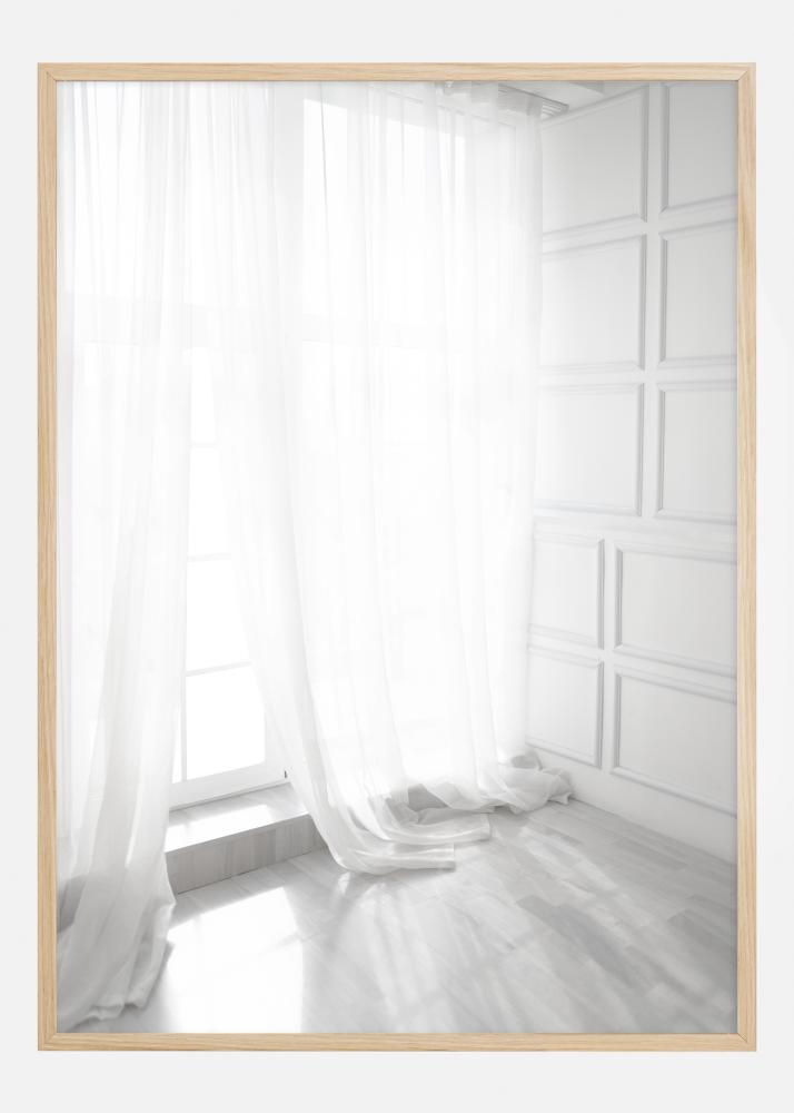 See rahulik ja puhastav poster kujutab rahuliku nurka toast, mis on kaetud läbipaistvate valgete kardinate abil. Valgus, mis filtreerub läbi kanga, loob varje ja varjundite mängu läikival põrandal, andes rahu ja selguse tunde. See minimalistlik print on väljendus rahulikkusest ja sobiks ideaalselt keskkonda, mis püüdleb lihtsuse ja rahu poole.