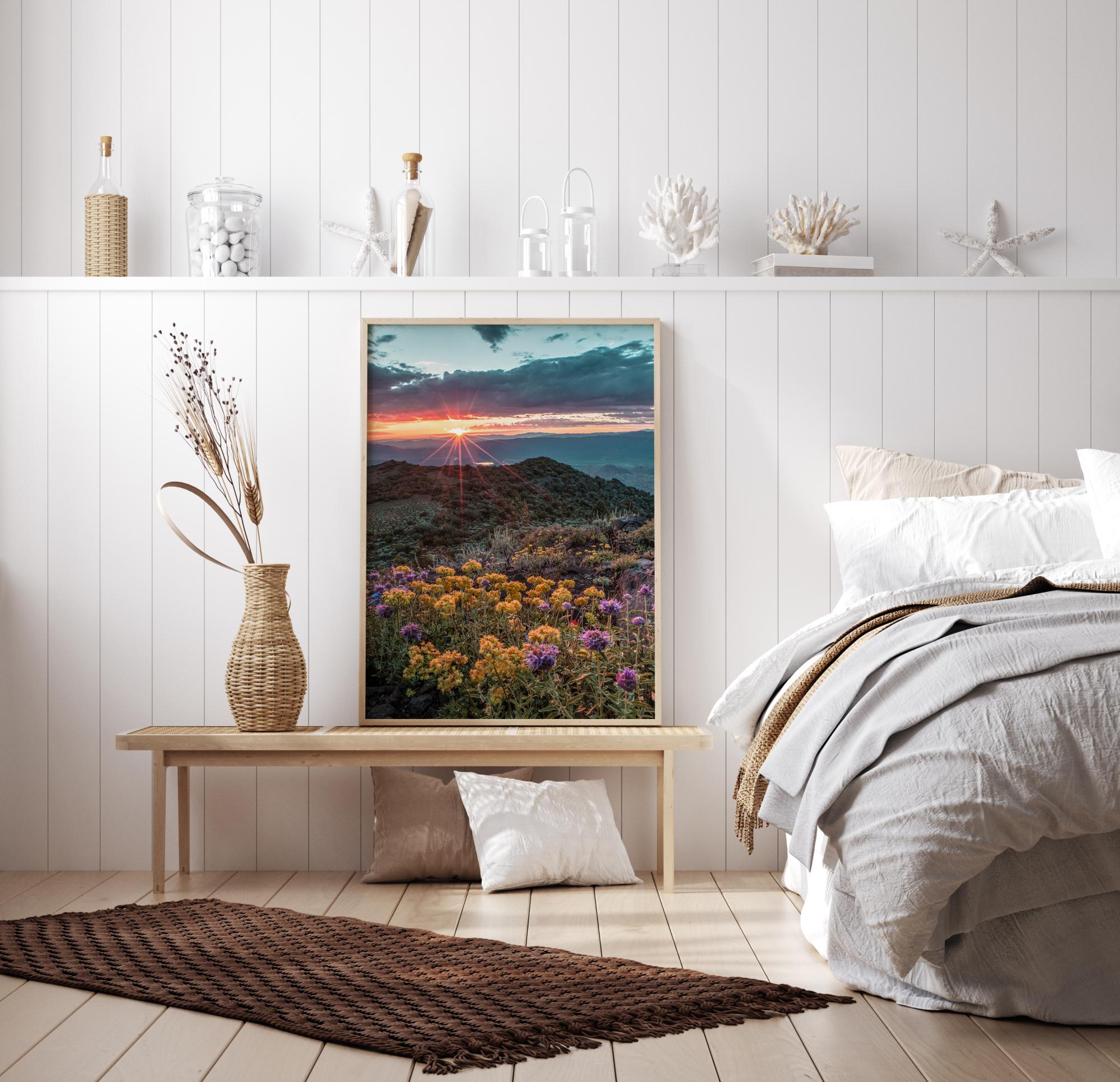 Loodusplakat looduslike lilledega mäenõlval imelise päikeseloojangu taustal. Kaunid kollased ja lillad lilled täidavad pildi, juhtides pilku mäetippudele ja hämarduvale taevale. Päikeseloojang paistab punase tähe kujul, pakkudes eristuvat fookuspunkti. Riputa see teos oma seinale, et kogeda osa loodusest kodus.