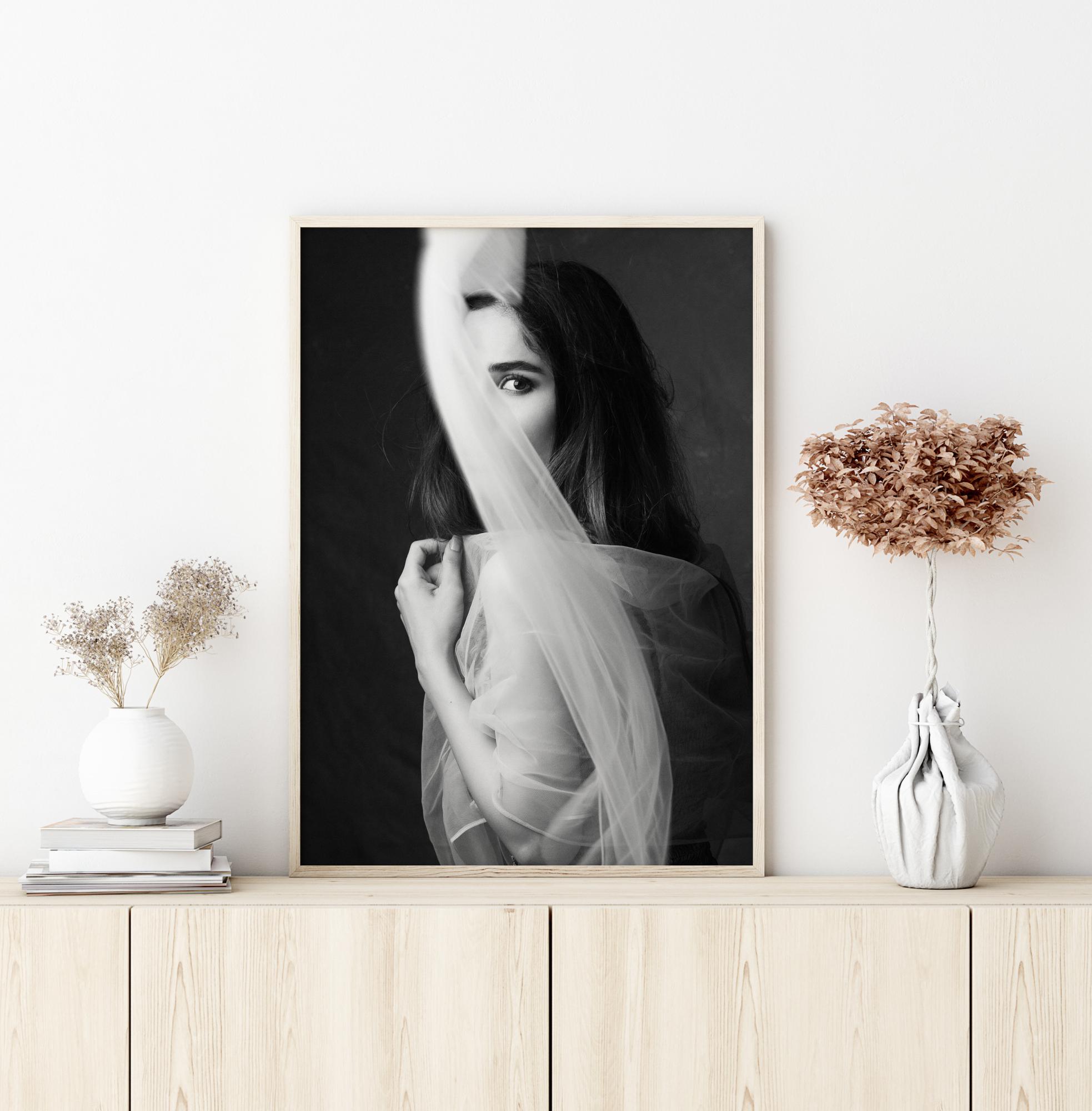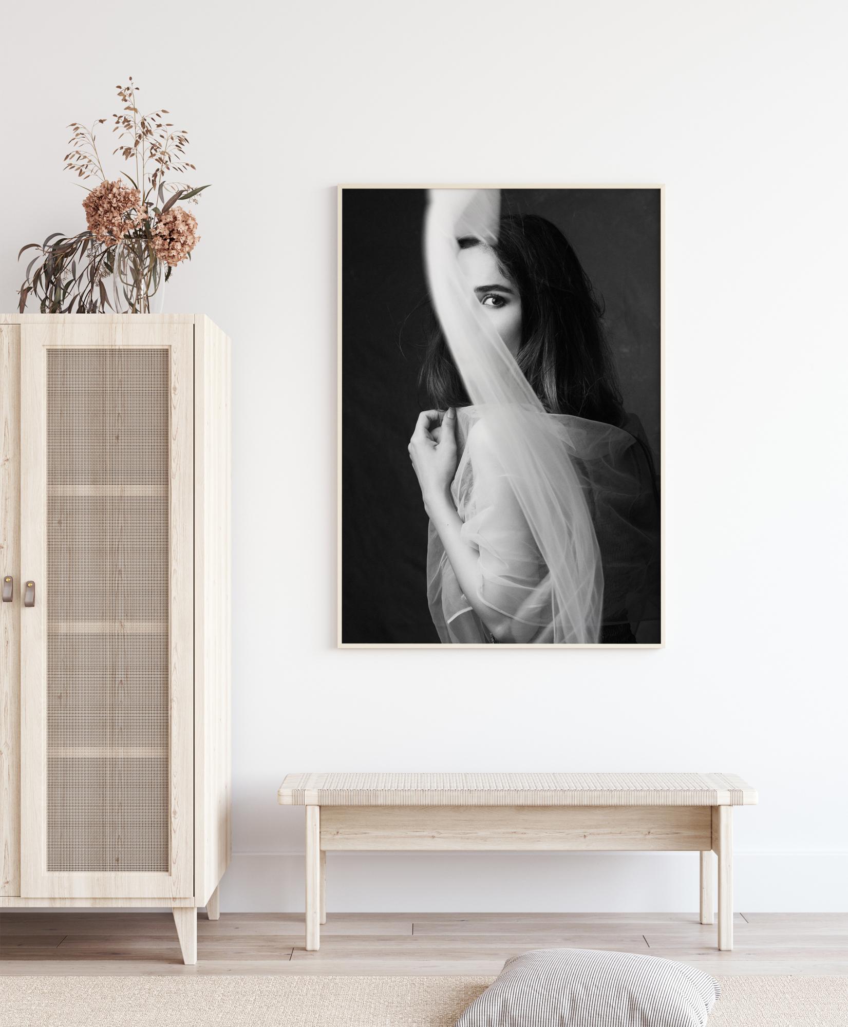 Meeliköitev foto naisest, kes peidab end kardina taha. Pehme kardina tõmme juhib pilgu naise näole. See plakat viib sind rahulikku kohta, kus saate ühenduse luua.