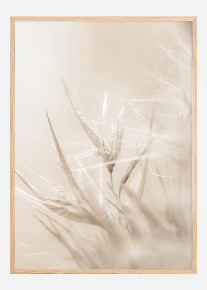 See plakat on uuring hapruse ja tugevuse kohta, lähivõte puhkeasendist taimeelust, mille üksikasjad ja tekstuurid on jäädvustatud hetkelises vaikuses. Pehme beež värvitoon ja kuivatatud õlekõrte õrnad detailid loovad unenäolise atmosfääri, mis on nii lõõgastav kui ka esteetiliselt köitev. See kunstiteos haarab looduse imelisi kontraste, tõstes esile selle õrna, kuid samas püsiva olemuse.