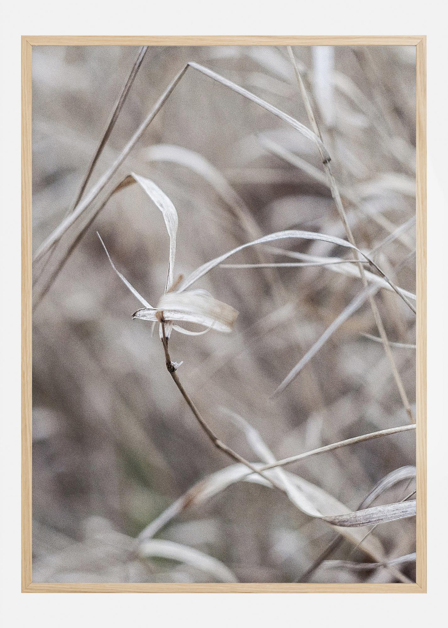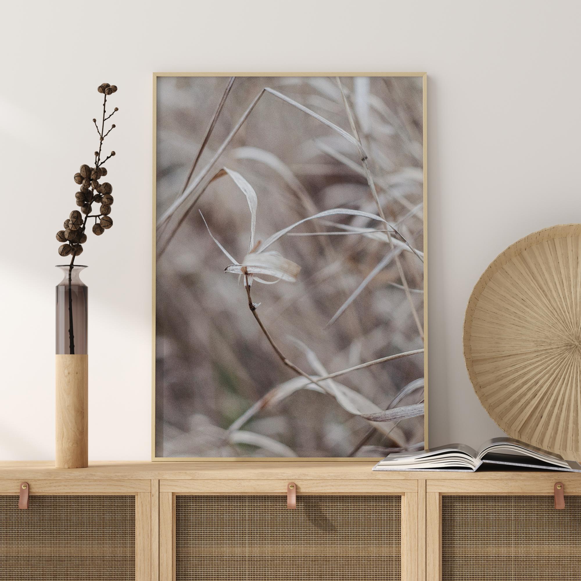 Elegantne looduse plakat pehmete lehtedega lähivaates. Pehmed varred ja lehed juhivad pilku läbi teose. Tänu fookusest väljas olevale taustale tekib sügavuse tunne. Riputa see pilt hele ühevärvilisele seinale, et pehmed neutraalsed pastelltoonid esile tõuseksid.