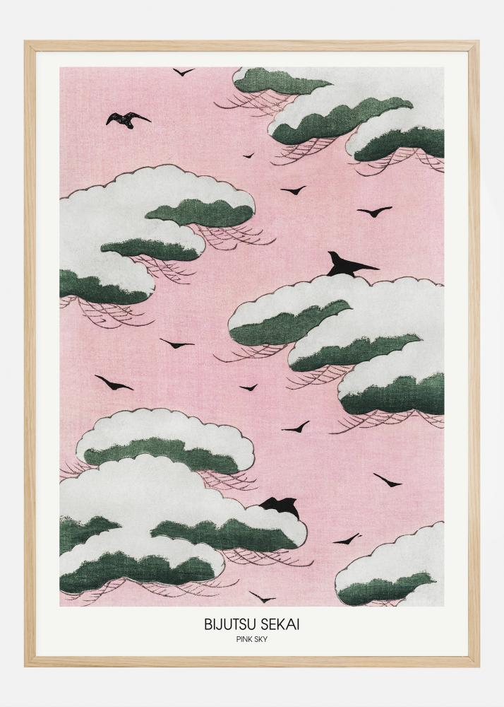 Selle rahustava ja poeetilise postri pealkirjaga "Bijutsu Sekai Pink Sky" jäädvustatakse vaikse hommiku või õhtu olemust pehmete roosade taevastega, mis pakuvad elegantset tausta hõljuvatele pilvedele ja lendavate lindude siluettidele. See trükis on rahu oaas ja sobiks ideaalselt magamistuppa või meditatsiooniruumi, kus see võib pakkuda rahumeelset ja mõtisklevat tunnet.