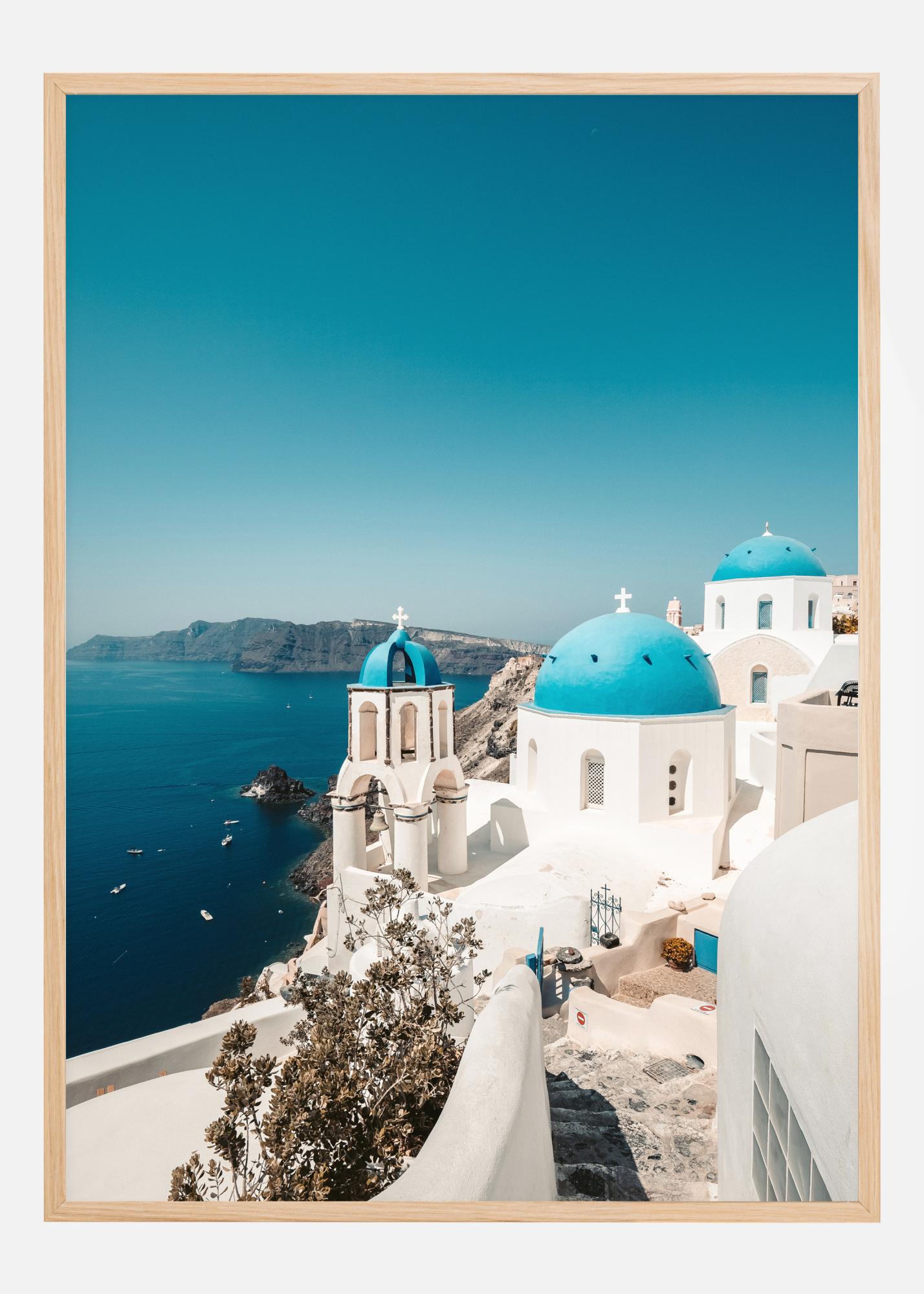 Hele plakat väikese Kreeka rannikulinnaga ja sügava sinise merega. Kõik hooned on imeliselt valged, siniste kuplitega, mis sobivad helkiva sinise mere ja taevaga. Kujutage ette, et see on teie rõdu ja teie vaade aknast, kui riputate selle pildi koduseinale.