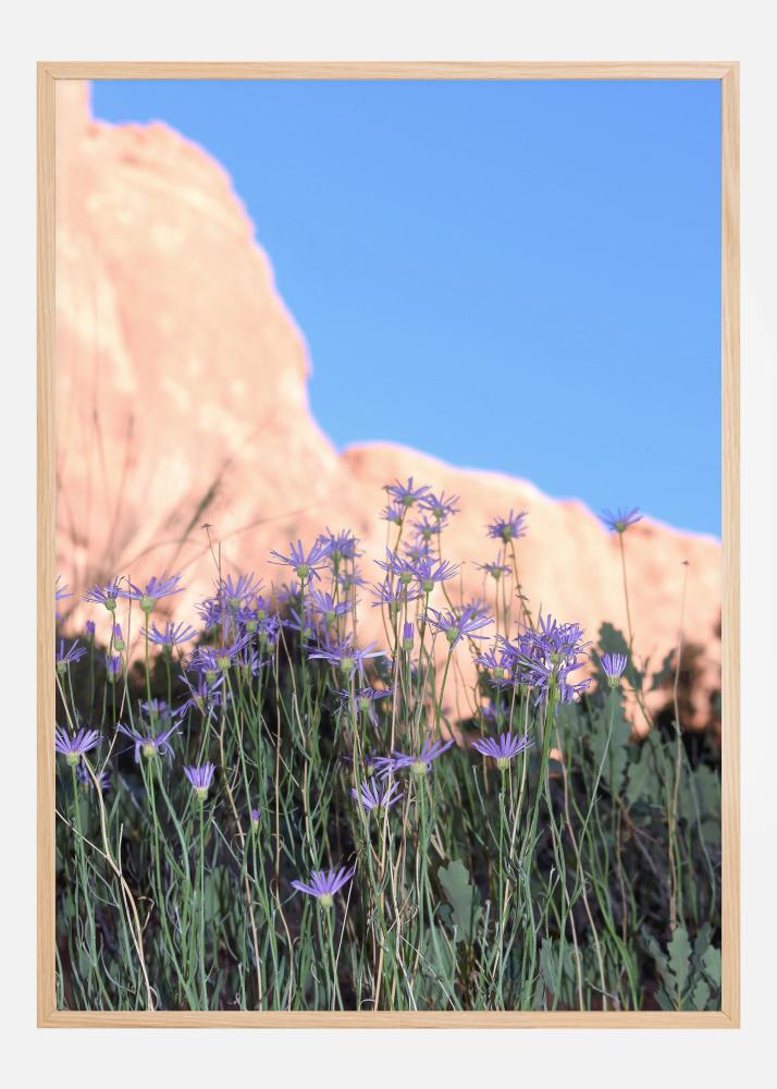 Särav looduslik plakat lilla lillede, kiviste mägede ja tugeva sinise taevaga. Lillad lilled on fookuses ja ulatuvad taeva poole, samas kui oranž mägi moodustab piiri laia avara taevaga. Lase end loodusesse eksida, kui tood selle teose koju ja riputad selle oma magamistuppa.