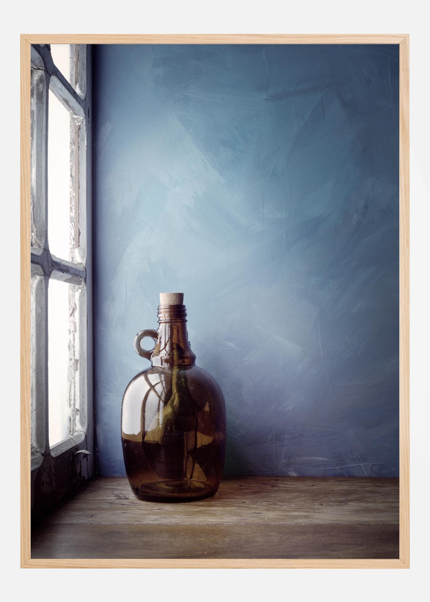 Natüürmordi plakat pruuni pudeliga sinise seina ees. Akna valgus paistab vasakult, valgustades pudelit, mis tekitab peegeldusi. Lisa oma kodule rustikaalset tunnetust pehme sinise seina ja vana puidust lauaga, millel pudel seisab.