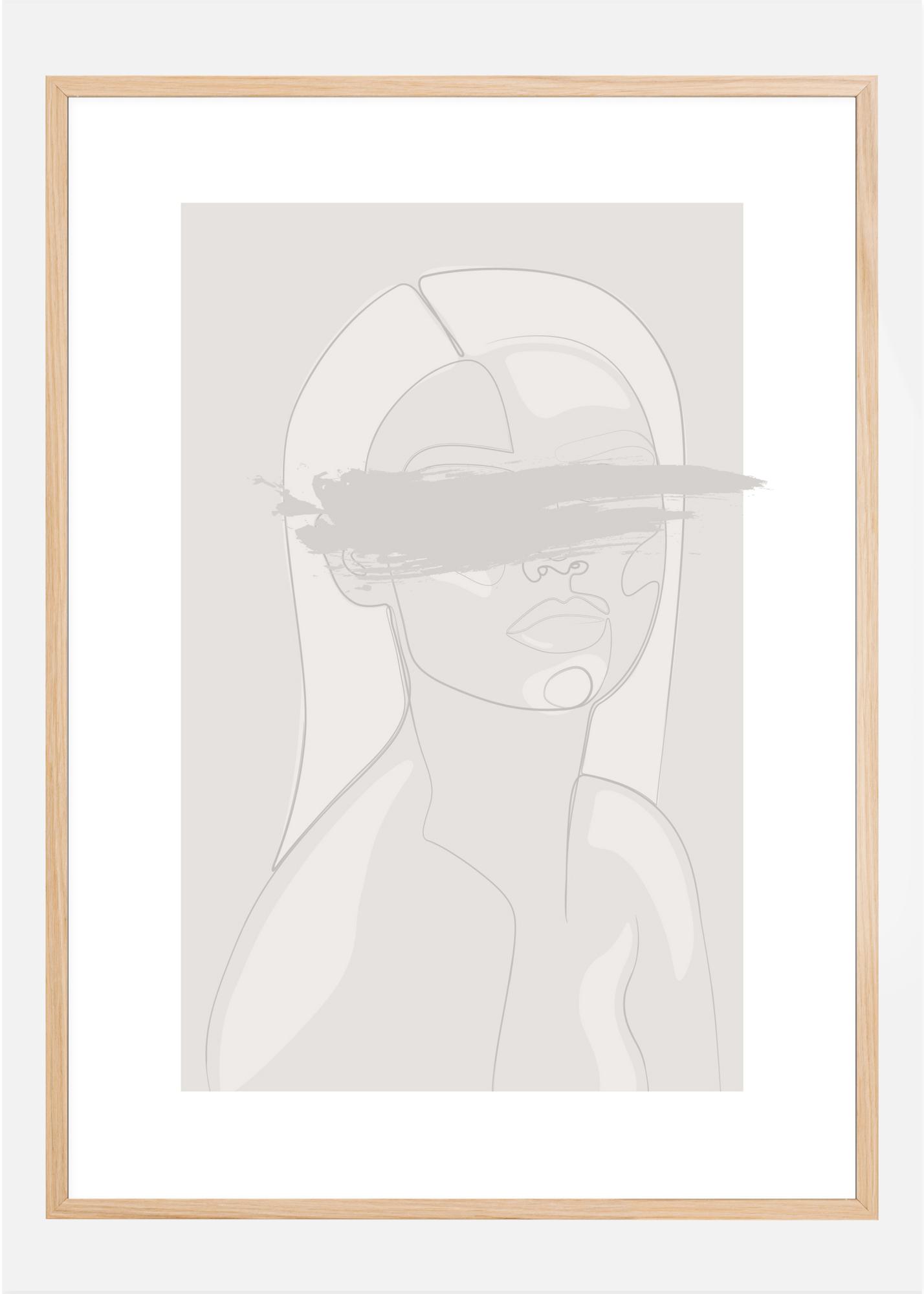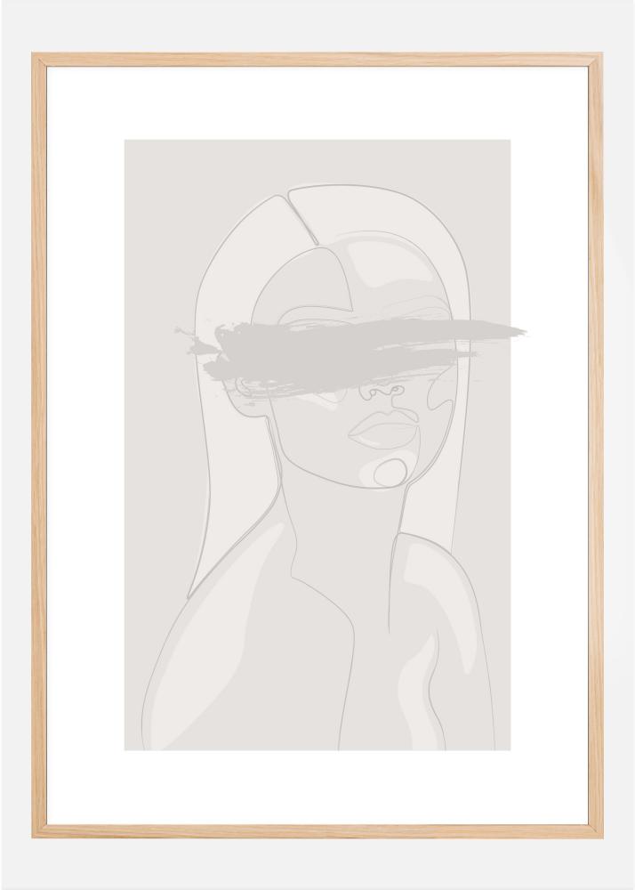 Abstraktne plakat naise kujutisega, kelle silmad on kaetud. See kahvatu valge ja hall pilt näitab naise pea ja õlgade kontuure plokkide ja joonte abil. Silmi kattev värvilaik lisab naisele salapärasust. Tugev valge raam ümbritseb teda, ideaalne riputamiseks julgelt värvilisele seinale kodus.