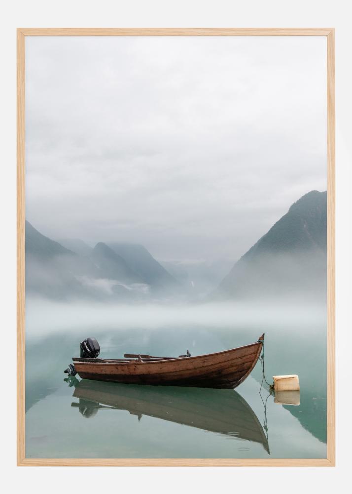Elegantne plakat paadiga uduhõlmas järve keskel. Esiplaanil paistab selgete detailidega pruun paat, millel on terav peegeldus vees. Taustal, udusse mähituna, seisavad veest tõusvad pehmed mäed. Too oma koju avatud maastiku rahu.