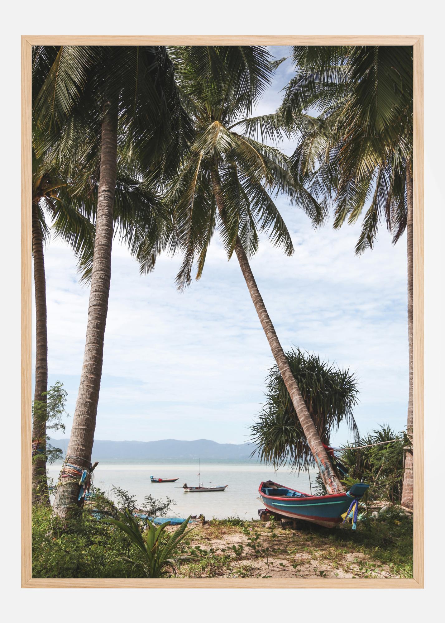 Puhkusplakat palmide ja paatidega Tais. Kaks palmi kalduvad üksteise poole, raamides taustal olevat merd, kus asuvad kaks paati. Kolmas punane ja sinine paat asuvad maa peal, tõmmates endale tähelepanu. Kujutage ette, et seisate rannas ja vaatate seda rahulikku pilti.
