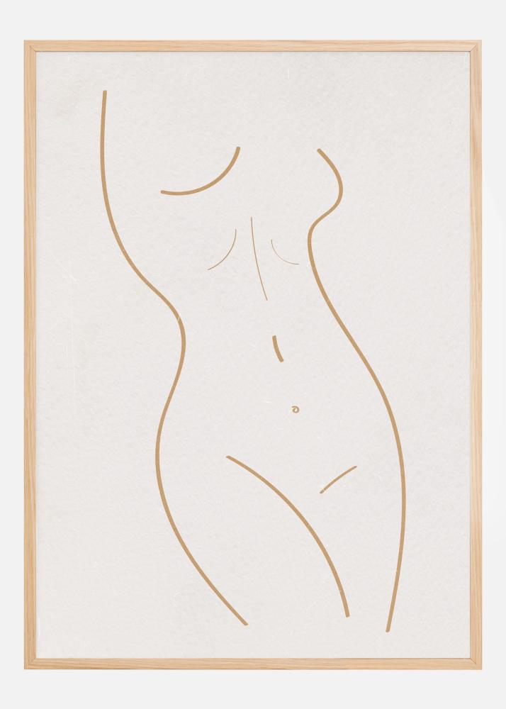 Plakat naise kujutisega pruunides joonistustes. Tugevad, julged pruunid jooned visandavad naise jalgu, kõhtu ja rindu. Jooned on ühtlased ja ülespoole liikuvad selles elegantses joonistuses. Riputage see teos lihtsa valge seina peale, et luua galerii tunne.