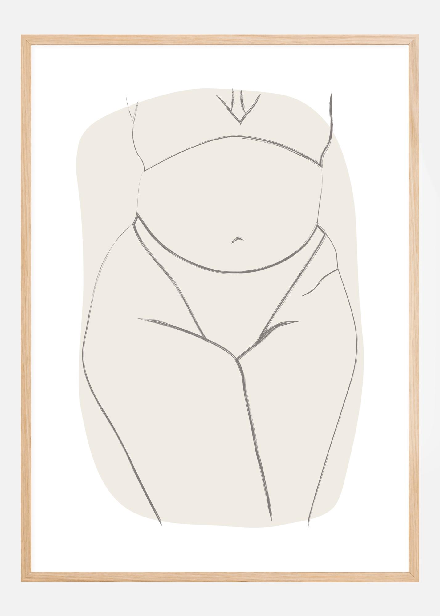 Lihtne plakat naise kõhu ja jalgade joonistusega. Tagasihoidlikult näitavad jooned naise ristatud jalgu, kui ta kannab lihtsat bikiinit. Jooned on esile tõstetud helehalliga, et luua kunstipärane teos. Parima efekti saavutamiseks sobita pilt värvilise seinaga.