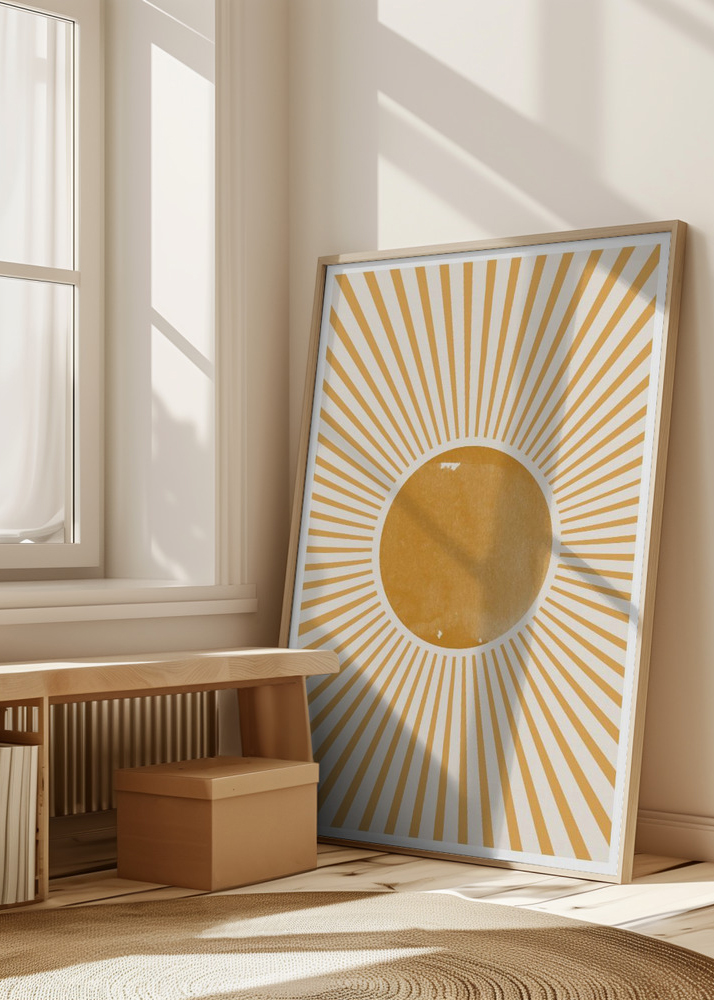 See elav plakat tekitab särava päikese tunde oma kiirgavate kuldsete joontega, mis ümbritsevad keskmist kollast ringi pehmel valgel taustal. Kujundus on inspireeritud boheemlaslikest ja geomeetrilistest mustritest, mis koos loovad kujutise päikese soojusest ja energiast. Soojad värvid ja särav muster on loodud andma rõõmu ja positiivsuse tunnet.