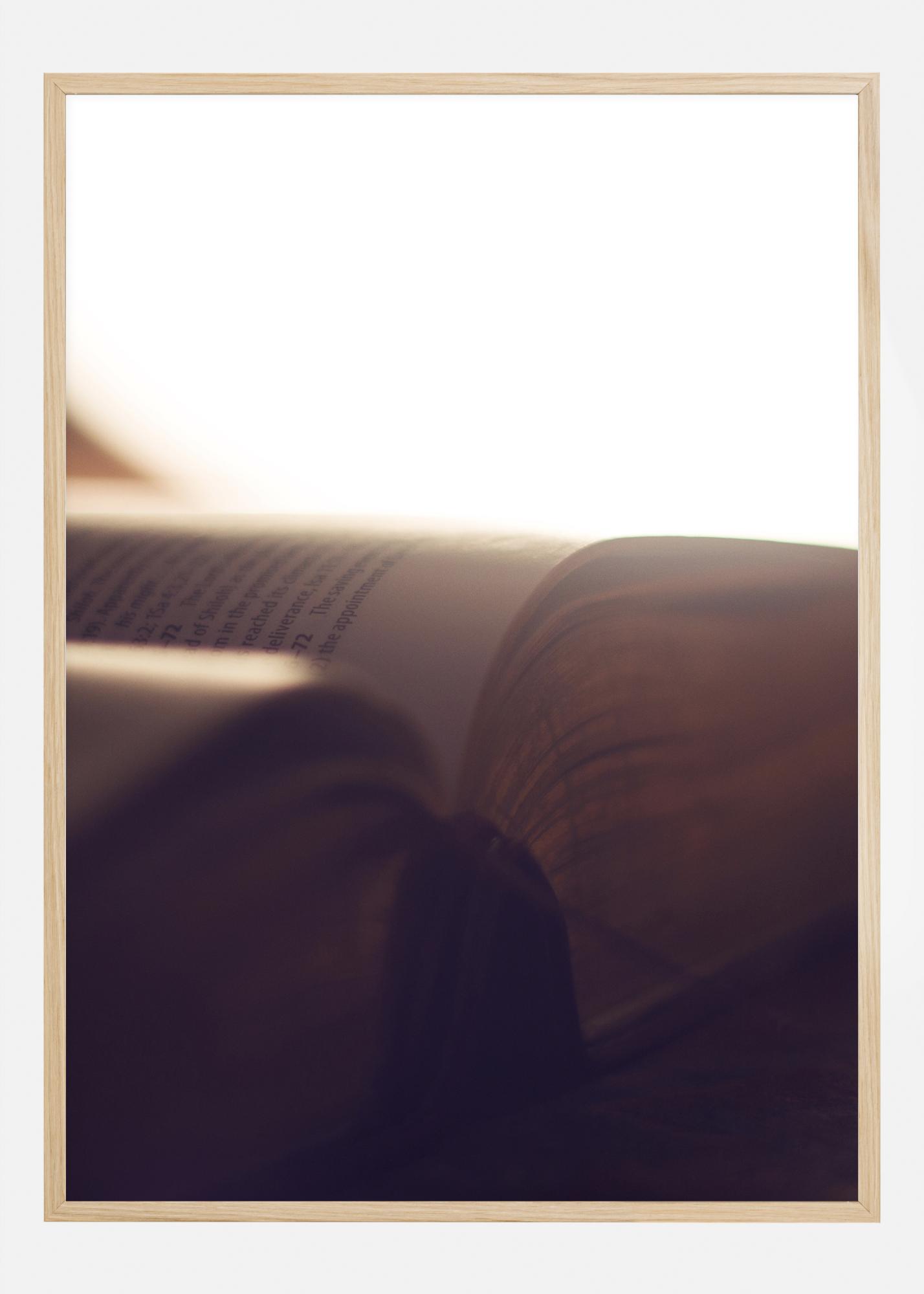 Lähivõtte plakat avatud raamatuga. Valge valgus täidab suurema osa sellest pildist, kuna paistab alla raamatule, mille lehekülgedel on kullatud servad. Sõnad on vaevu nähtavad, muutes selle ideaalseks prindiks õpperuumi jaoks.