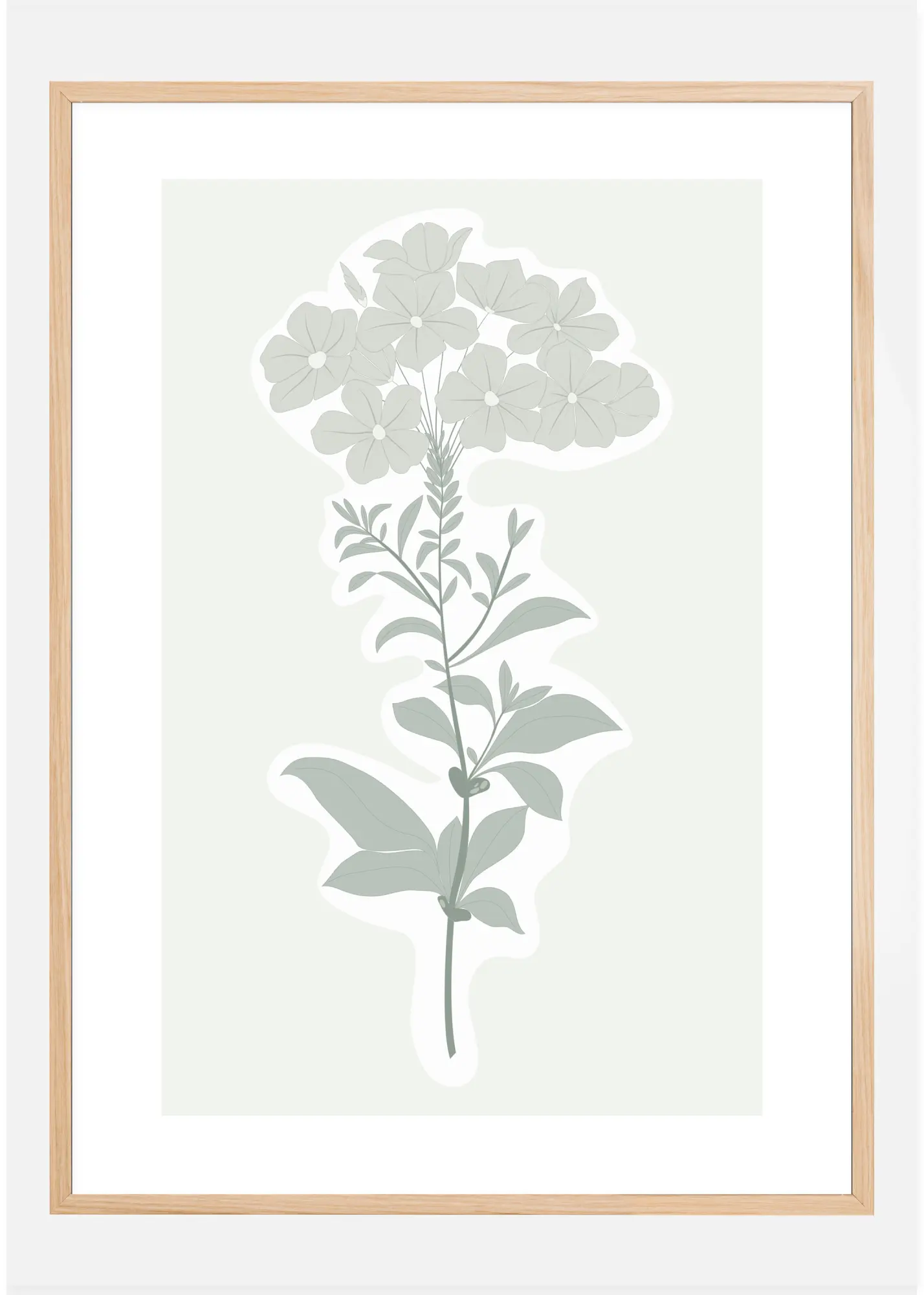 Plakat lihtsa botaanilise trükiga lillest ja selle lehtedest. Pehmed hallrohelised värvid moodustavad selle lihtsa, kuid elegantse, lillede varre. Valge ja halliga raamitud, toob see trükk ellu vanaaegsete botaaniliste illustratsioonide mälestused. Näita oma aeda selle võluva trüki abil.