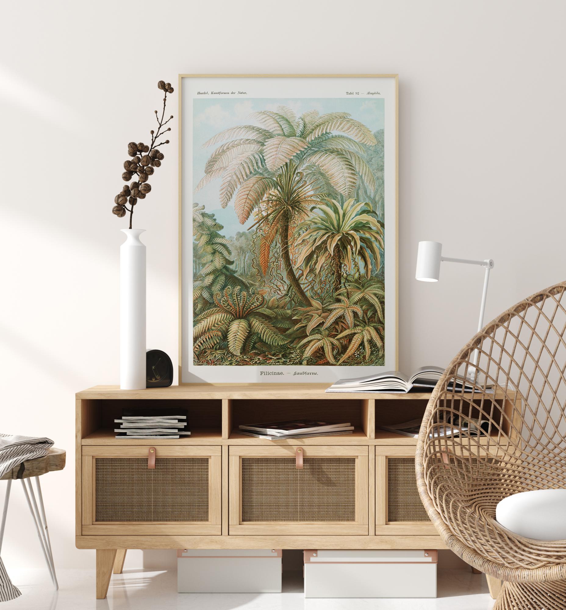 Illustratsioon botaanikas plakatil erinevate taimedega. Suured palmilehed ja sõnajalad katavad kogu selle pildi. Roheline, sinine ja oranž loovad pehmed toonid selles antiikses saksa teaduslikus joonistuses. Anna oma kodule ajaloo puudutus nende taimede ja nende ladinakeelsete nimede abil.