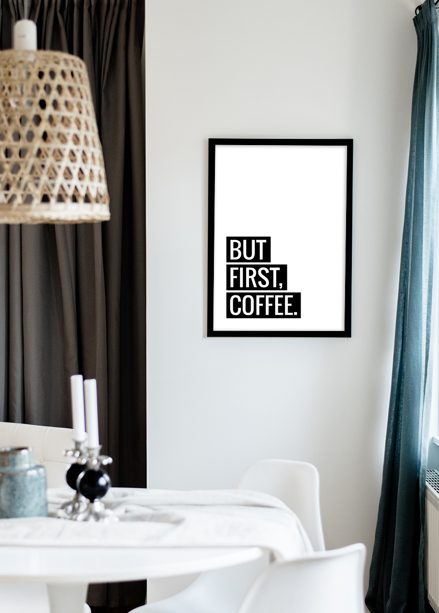 Reisi ümber maailma, alusta oma ettevõtet, õpi žongleerima samal ajal, kui tasakaalustad end ülikiirel joonel! Kuid kõigepealt – kohv. See stiilne poster sobib sulle, kes peab seda imelist jooki igapäevaelu oluliseks osaks. Riputa see köögilaua kohale või kontorisse! Plakat on valge tekstiga ”But first, coffee” valgel taustal musta vastu. Mustvalge disain sobib suurepäraselt kokku raamiga või paspartuuga põnevas värvitoonis. Vali 6 erineva formaadi vahel.
