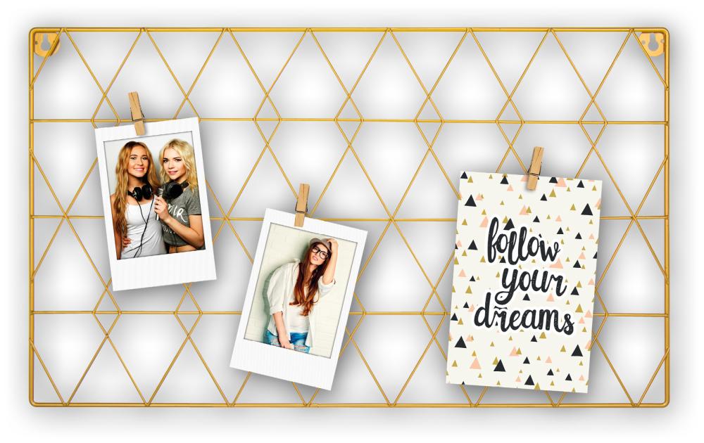 Kollaažraam, mis on kujundatud nagu teadetetahvel, kuhu kinnitate oma fotod klambritega. Raam on valmistatud metallist ja on kuldses toonis. Kuna kinnitate oma pildid ise, saate valida erinevas suuruses fotode segamise ning samuti oma loovust väljendada, kinnitades näiteks väiksemaid postreid või ilusaid kaarte! Raami välismõõtmed on 50x30 cm. See raam sobib eriti hästi kirjutuslaua kohal, köögis või mõnes muus kohas, kus see saab oma dekoratiivset ja funktsionaalset eesmärki täita. Seinale kinnitamise võimalus on olemas.